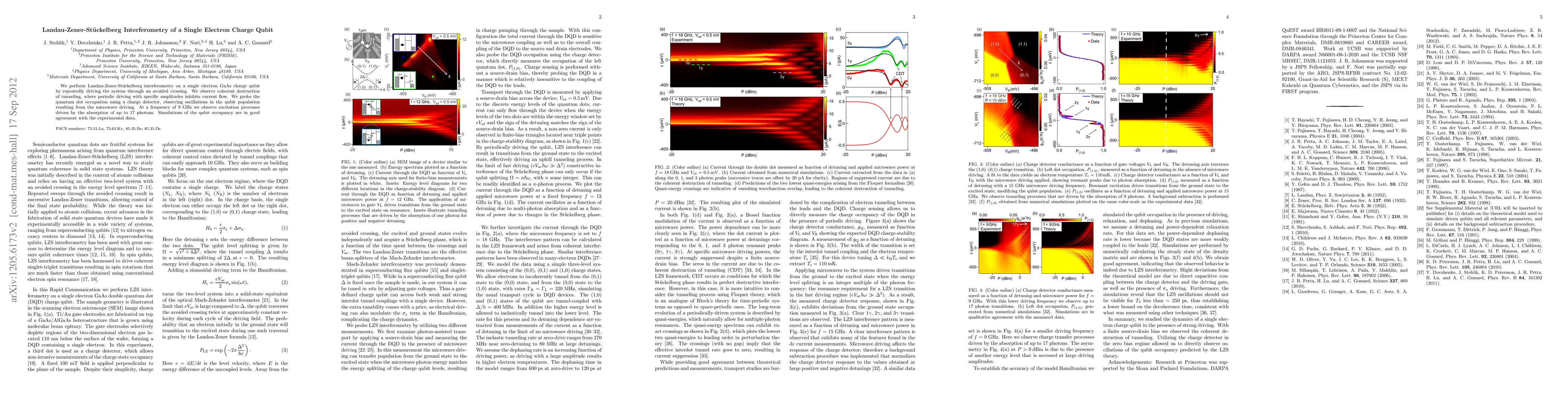 This study investigates Landau-Zener-Stuckelberg interferometry on a single electron charge qubit in GaAs, observing coherent destruction of tunneling and oscillations in qubit population due to microwave driving. Simulations align well with the observed excitation processes at 9 GHz, driven by up to 17 photon absorption.
