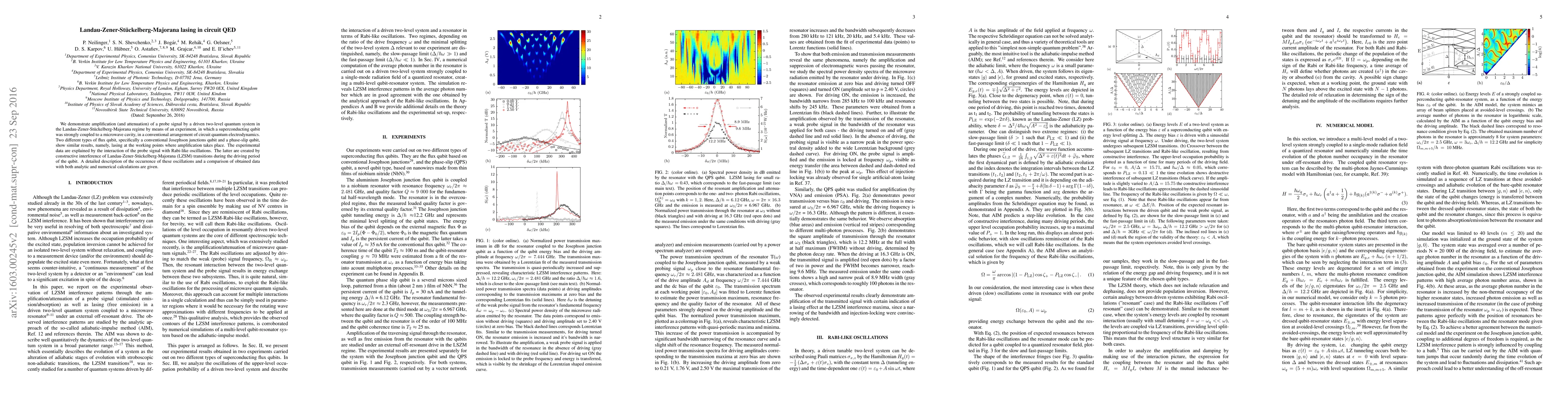 We demonstrate amplification (and attenuation) of a probe signal by a driven two-level quantum system in the Landau-Zener-St\"{u}ckelberg-Majorana regime by means of an experiment, in which a superconducting qubit was strongly coupled to a microwave cavity, in a conventional arrangement of circuit quantum electrodynamics. Two different types of flux qubit, specifically a conventional Josephson junctions qubit and a phase-slip qubit, show similar results, namely, lasing at the working points where amplification takes place. The experimental data are explained by the interaction of the probe signal with Rabi-like oscillations. The latter are created by constructive interference of Landau-Zener-St\"{u}ckelberg-Majorana (LZSM) transitions during the driving period of the qubit. A detailed description of the occurrence of these oscillations and a comparison of obtained data with both analytic and numerical calculations are given.