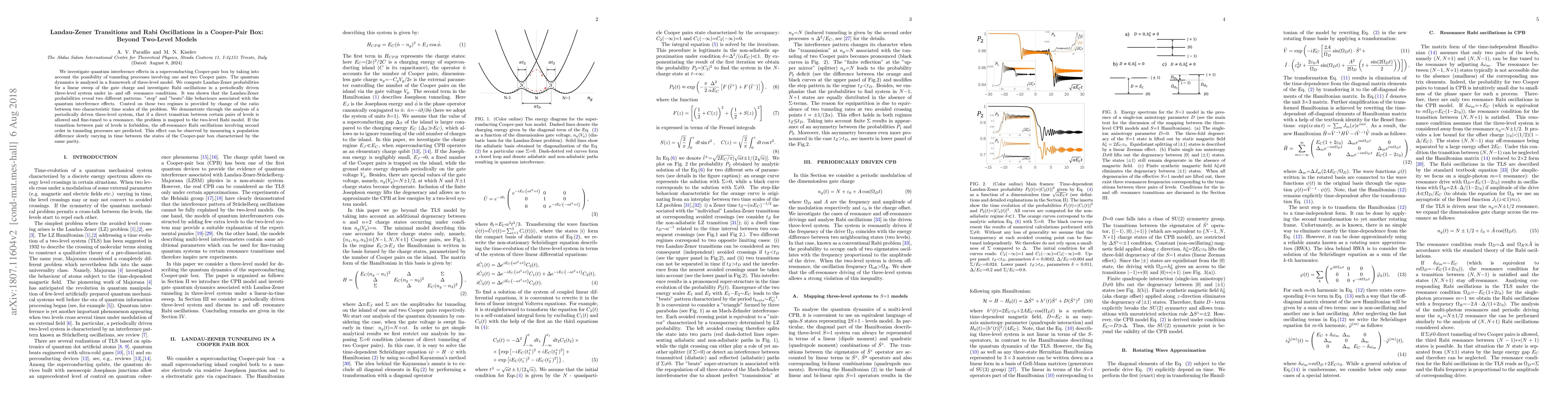 This paper explores quantum interference effects in a Cooper-pair box using a three-level model, analyzing Landau-Zener transitions and Rabi oscillations. It reveals distinct "step" and "beats" patterns in Landau-Zener probabilities due to quantum interference, with control over these regimes achievable by adjusting characteristic time scales.