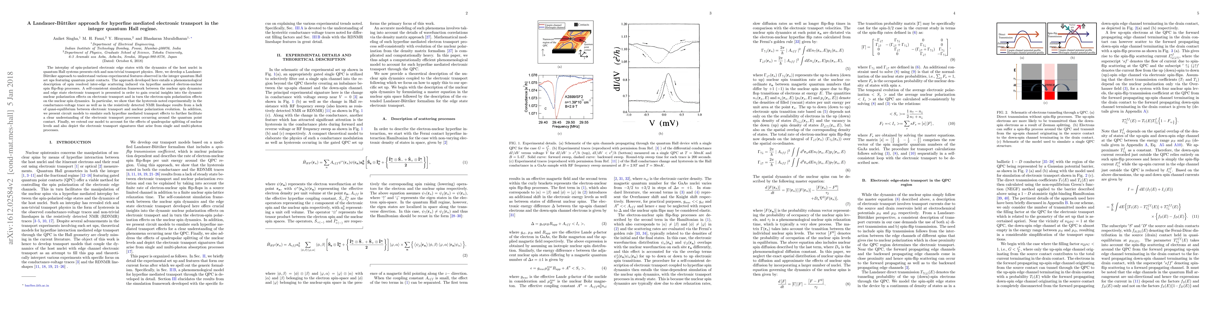 This paper develops a Landauer-Büttiker approach to analyze hyperfine-mediated electronic transport in quantum Hall systems, focusing on spin-polarized edge states and their interaction with nuclear spins. It reveals that experimental hysteresis in conductance and NMR lineshapes arises from the disequilibrium between electronic transport and nuclear polarization dynamics.