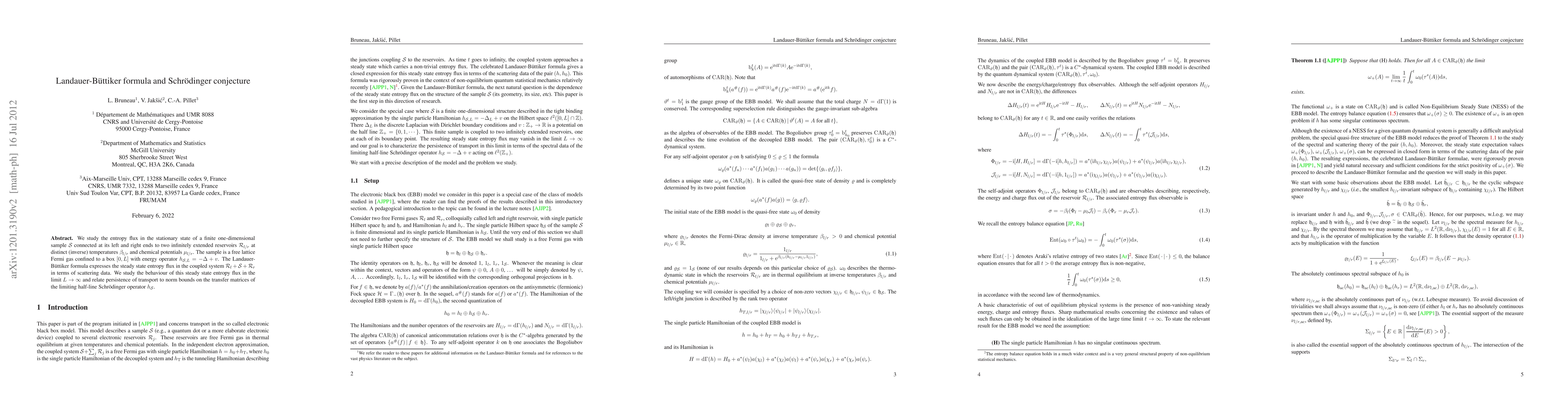 This paper studies entropy flux in a finite one-dimensional sample connected to reservoirs at distinct temperatures, relating it to the Schr"odinger conjecture and its connection to persistence of transport in a limiting half-line operator.