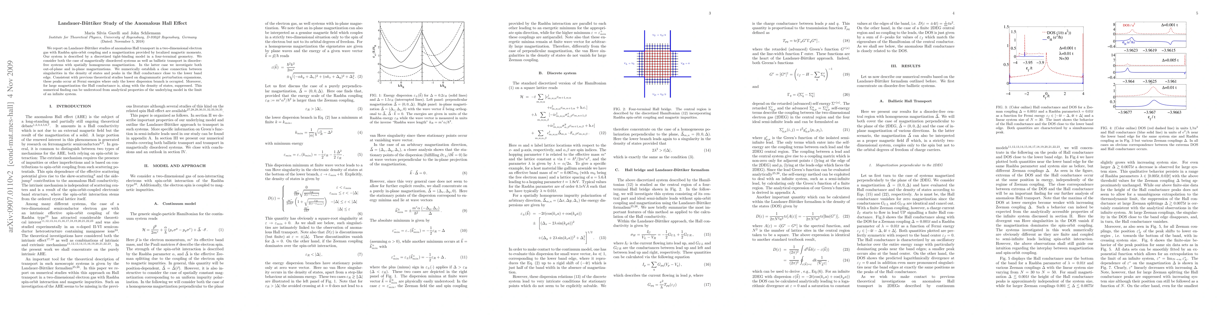 We report on Landauer-B\"uttiker studies of anomalous Hall transport in a two-dimensional electron gas with Rashba spin-orbit coupling and a magnetization provided by localized magnetic moments. Our system is described by a discretized tight-binding model in a four-terminal geometry. We consider both the case of magnetically disordered systems as well as ballistic transport in disorder-free systems with spatially homoge- neous magnetization. In the latter case we investigate both out-of-plane and in-plane magnetizations. We numerically establish a close connection between singularities in the density of states and peaks in the Hall conductance close to the lower band edge. Consistent with previous theoretical studies based on diagrammatic perturbation expansions, these peaks occur at Fermi energies where only the lower dispersion branch is occupied. Moreover, for large magnetization the Hall conductance is, along with the density of states, sup- pressed. This numerical finding can be understood from analytical properties of the underlying model in the limit of an infinite system.