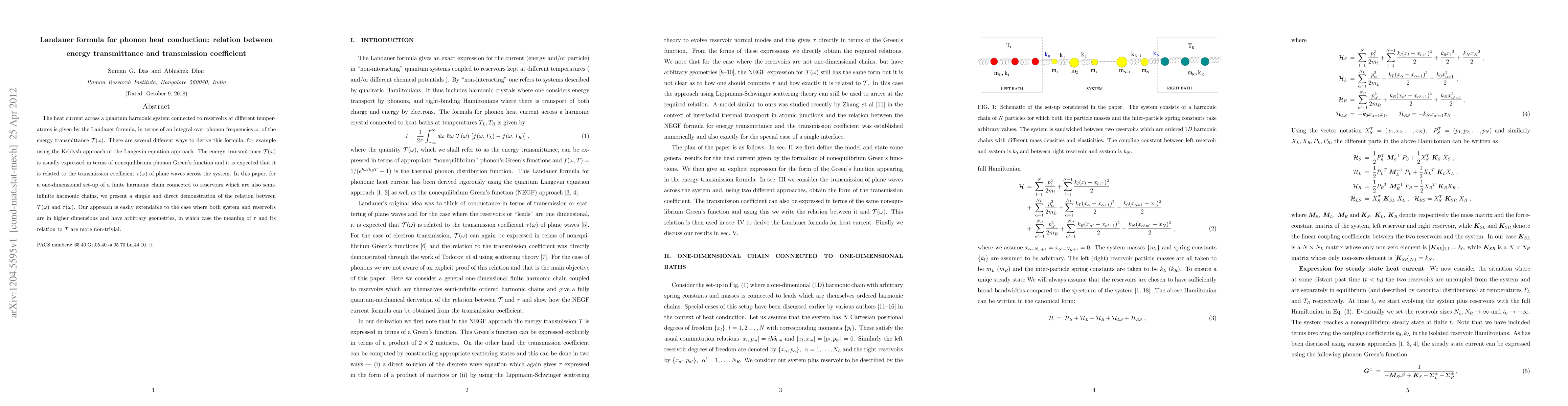 The heat current across a quantum harmonic system connected to reservoirs at different temperatures is given by the Landauer formula, in terms of an integral over phonon frequencies \omega, of the energy transmittance T(\omega). There are several different ways to derive this formula, for example using the Keldysh approach or the Langevin equation approach. The energy transmittance T({\omega}) is usually expressed in terms of nonequilibrium phonon Green's function and it is expected that it is related to the transmission coefficient {\tau}({\omega}) of plane waves across the system. In this paper, for a one-dimensional set-up of a finite harmonic chain connected to reservoirs which are also semi-infinite harmonic chains, we present a simple and direct demonstration of the relation between T({\omega}) and {\tau}({\omega}). Our approach is easily extendable to the case where both system and reservoirs are in higher dimensions and have arbitrary geometries, in which case the meaning of {\tau} and its relation to T are more non-trivial.