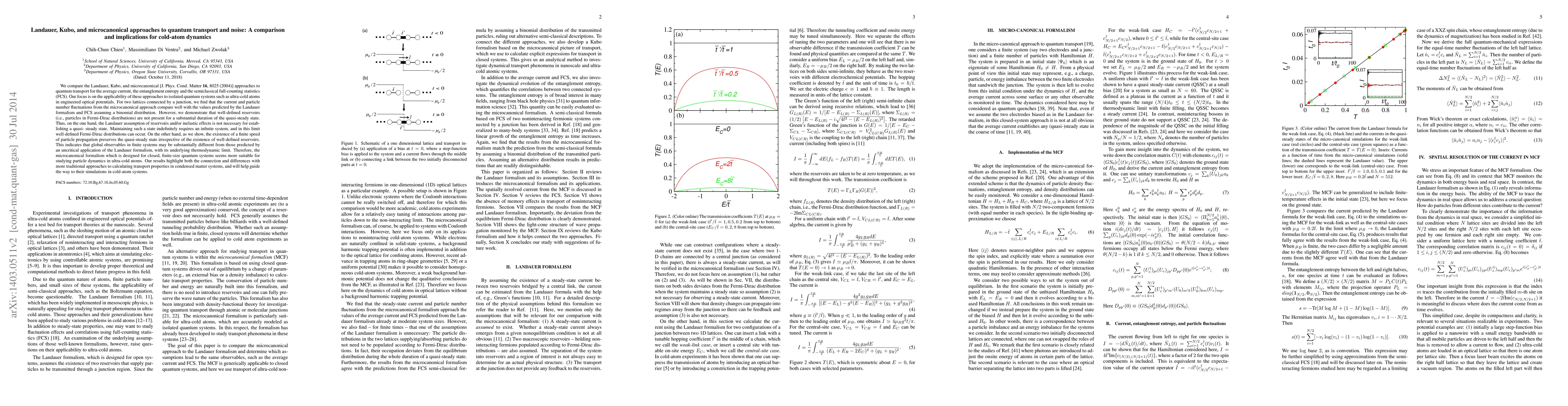 We compare the Landauer, Kubo, and microcanonical [J. Phys. Cond. Matter {\bf 16}, 8025 (2004)] approaches to quantum transport for the average current, the entanglement entropy and the semiclassical full-counting statistics (FCS). Our focus is on the applicability of these approaches to isolated quantum systems such as ultra-cold atoms in engineered optical potentials. For two lattices connected by a junction, we find that the current and particle number fluctuations from the microcanonical approach compare well with the values predicted by the Landauer formalism and FCS assuming a binomial distribution. However, we demonstrate that well-defined reservoirs (i.e., particles in Fermi-Dirac distributions) are not present for a substantial duration of the quasi-steady state. Thus, the Landauer assumption of reservoirs and/or inelastic effects is not necessary for establishing a quasi-steady state. Maintaining such a state indefinitely requires an infinite system, and in this limit well-defined Fermi-Dirac distributions can occur. A Kubo approach -- in the spirit of the microcanonical picture -- bridges the gap between the two formalisms, giving explicit analytical expressions for the formation of the steady state. The microcanonical formalism is designed for closed, finite-size quantum systems and is thus more suitable for studying particle dynamics in ultra-cold atoms. Our results highlight both the connection and differences with more traditional approaches to calculating transport properties in condensed matter systems, and will help guide the way to their simulations in cold-atom systems.