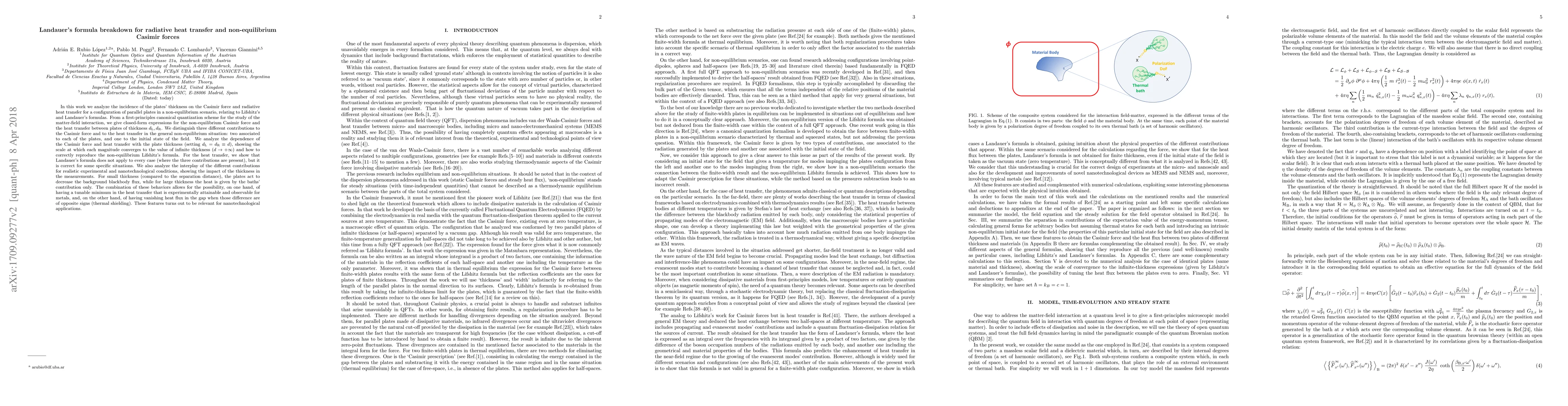 In this work we analyze the incidence of the plates' thickness on the Casimir force and radiative heat transfer for a configuration of parallel plates in a non-equilibrium scenario, relating to Lifshitz's and Landauer's formulas. From a first-principles canonical quantization scheme for the study of the matter-field interaction, we give closed-form expressions for the non-equilibrium Casimir force and the heat transfer between plates of thickness $d_{\rm L},d_{\rm R}$. We distinguish three different contributions to the Casimir force and to the heat transfer in the general non-equilibrium situation: two associated to each of the plates, and one to the initial state of the field. We analyze the dependence of the Casimir force and heat transfer with the plate thickness (setting $d_{\rm L}=d_{\rm R}\equiv d$), showing the scale at which each magnitude converges to the value of infinite thickness ($d\rightarrow+\infty$) and how to correctly reproduce the non-equilibrium Lifshitz's formula. For the heat transfer, we show that Landauer's formula does not apply to every case (where the three contributions are present), but it is correct for some specific situations. We also analyze the interplay of the different contributions for realistic experimental and nanotechnological conditions, showing the impact of the thickness in the measurements. For small thickness (compared to the separation distance), the plates act to decrease the background blackbody flux, while for large thickness the heat is given by the baths' contribution only. The combination of these behaviors allows for the possibility of having a tunable minimum in the heat transfer that is experimentally attainable and observable for metals, and also of having vanishing heat flux in the gap when those difference are of opposite signs (thermal shielding). These features turns out to be relevant for nanotechnological applications.
