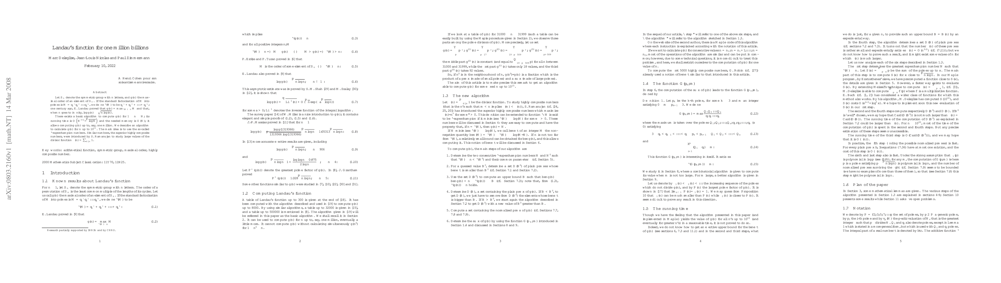 Let ${\mathfrak S}_n$ denote the symmetric group with $n$ letters, and $g(n)$ the maximal order of an element of ${\mathfrak S}_n$. If the standard factorization of $M$ into primes is $M=q_1^{\al_1}q_2^{\al_2}... q_k^{\al_k}$, we define $\ell(M)$ to be $q_1^{\al_1}+q_2^{\al_2}+... +q_k^{\al_k}$; one century ago, E. Landau proved that $g(n)=\max_{\ell(M)\le n} M$ and that, when $n$ goes to infinity, $\log g(n) \sim \sqrt{n\log(n)}$. There exists a basic algorithm to compute $g(n)$ for $1 \le n \le N$; its running time is $\co(N^{3/2}/\sqrt{\log N})$ and the needed memory is $\co(N)$; it allows computing $g(n)$ up to, say, one million. We describe an algorithm to calculate $g(n)$ for $n$ up to $10^{15}$. The main idea is to use the so-called {\it $\ell$-superchampion numbers}. Similar numbers, the {\it superior highly composite numbers}, were introduced by S. Ramanujan to study large values of the divisor function $\tau(n)=\sum_{d\dv n} 1$.