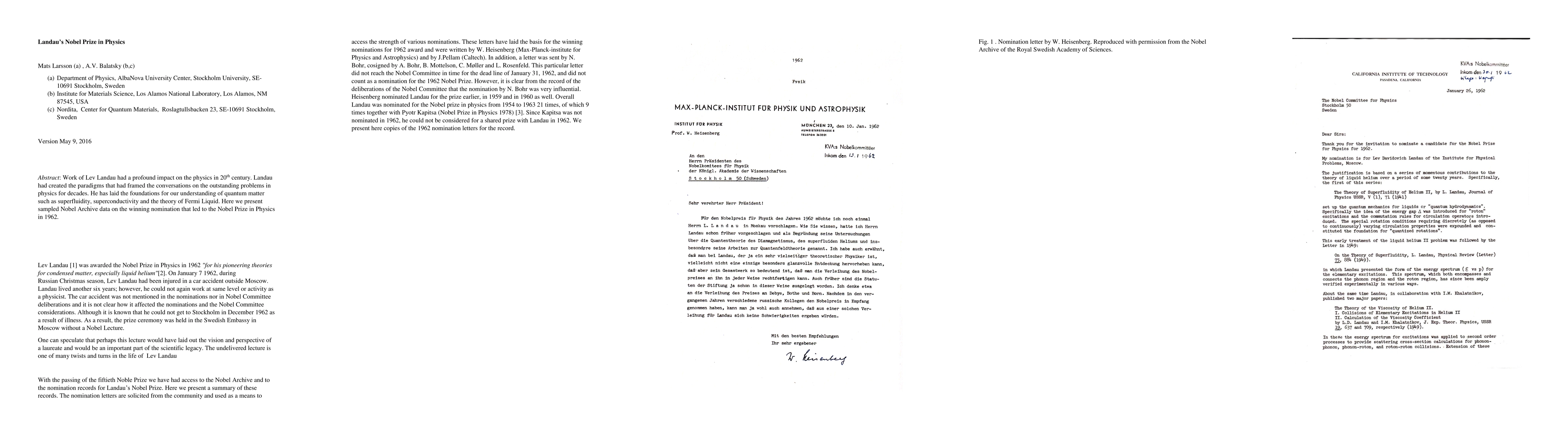 Summary: Lev Landau's groundbreaking work on quantum matter, including superfluidity, superconductivity, and the theory of Fermi Liquid, profoundly influenced 20th-century physics, culminating in his Nobel Prize in Physics in 1962. This paper presents selected data from the Nobel Archive regarding his winning nomination.