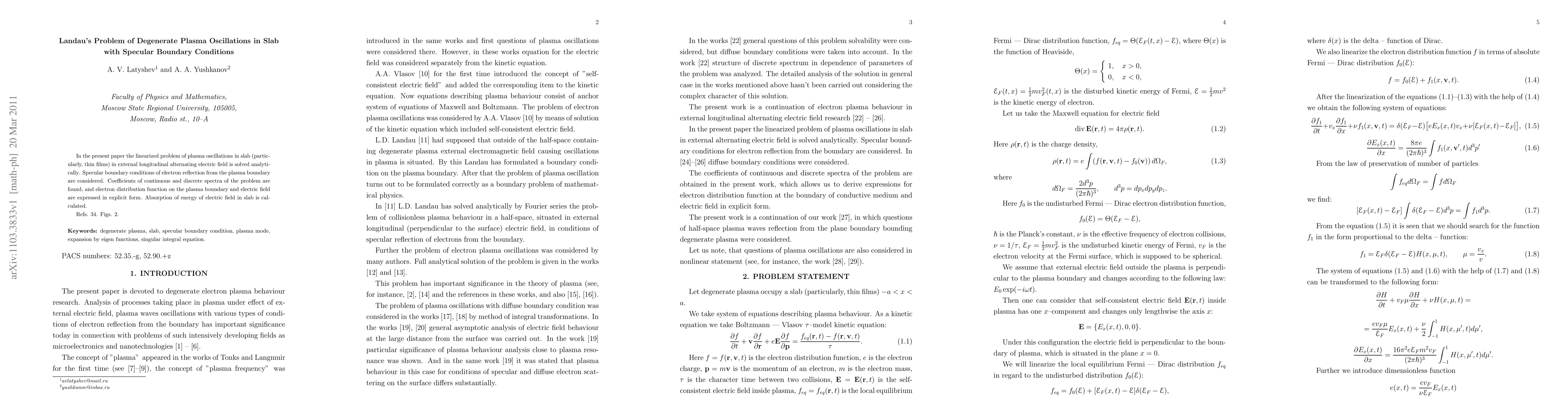This paper analytically solves the linearized problem of plasma oscillations in thin slab films under an external alternating electric field, considering specular boundary conditions. It derives explicit expressions for the electron distribution function, electric field, and calculates energy absorption in the slab.