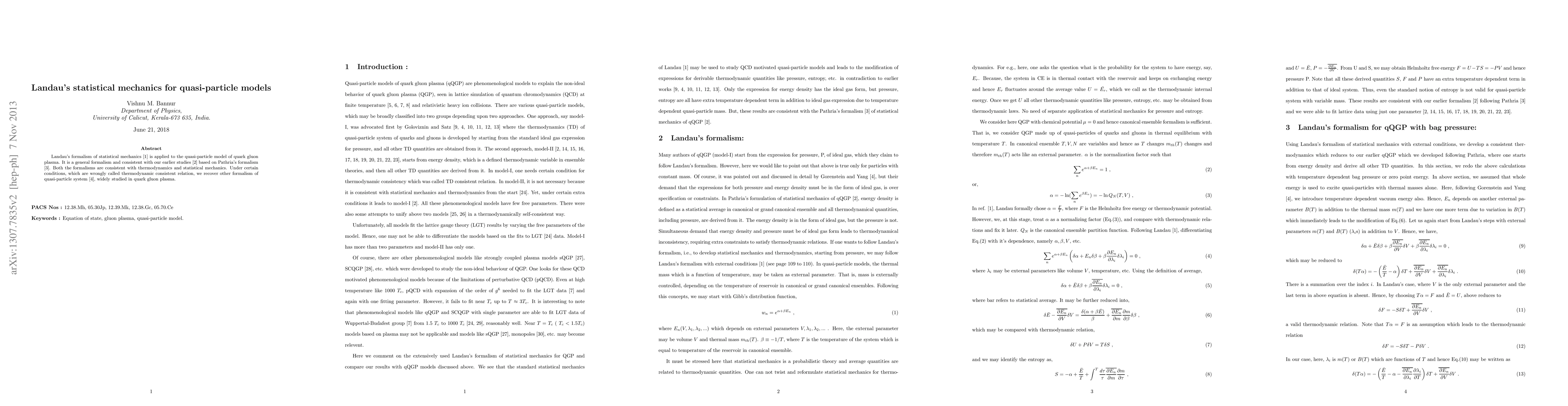 Landau's formalism of statistical mechanics \cite{la.1} is applied to the quasiparticle model of quark gluon plasma. It is a general formalism and consistent with our earlier studies \cite{ba.1} based on Pathria's formalism \cite{pa.1}. Both the formalism are consistent with thermodynamics and statistical mechanics. Under certain conditions, which are wrongly called thermodynamic consistent relation, we recover other formalism of quasiparticle system \cite{go.1}, widely studied in quark gluon plasma.