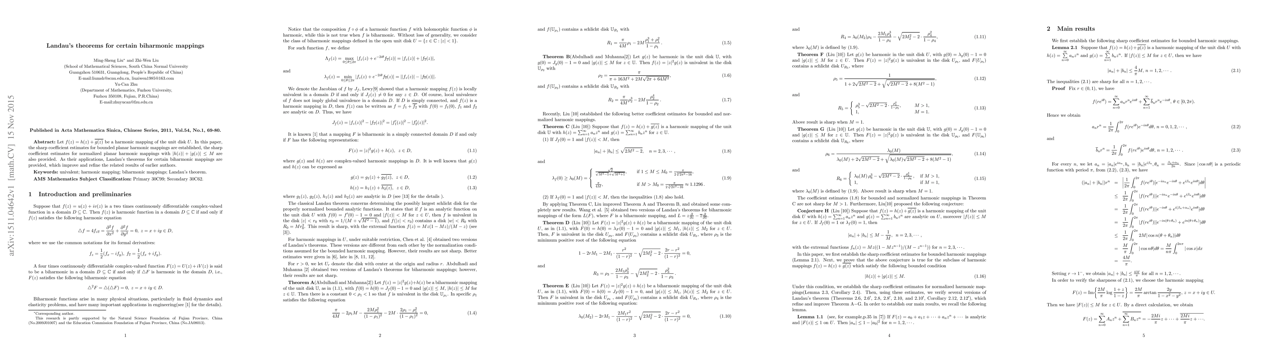 Let $f(z)=h(z)+\overline{g(z)}$ be a harmonic mapping of the unit disk $U$. In this paper, the sharp coefficient estimates for bounded planar harmonic mappings are established, the sharp coefficient estimates for normalized planar harmonic mappings with $|h(z)|+|g(z)|\leq M$ are also provided. As their applications, Landau's theorems for certain biharmonic mappings are provided, which improve and refine the related results of earlier authors.