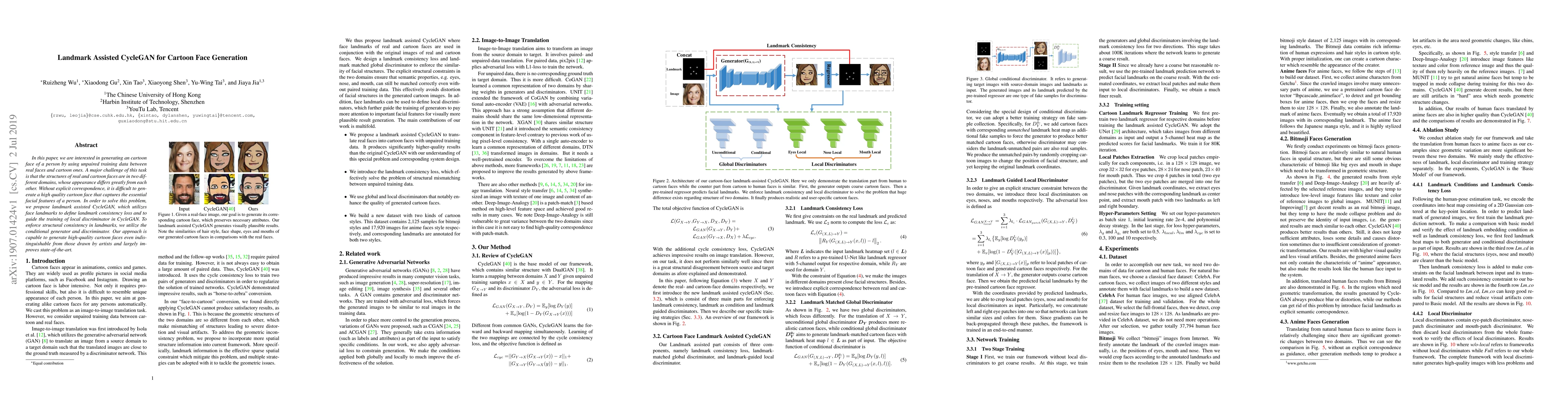 This paper proposes a landmark assisted CycleGAN to generate high-quality cartoon faces from real faces using unpaired training data. It leverages face landmarks to enforce structural consistency and improve the generation of essential facial features, achieving results comparable to artist-drawn cartoons.