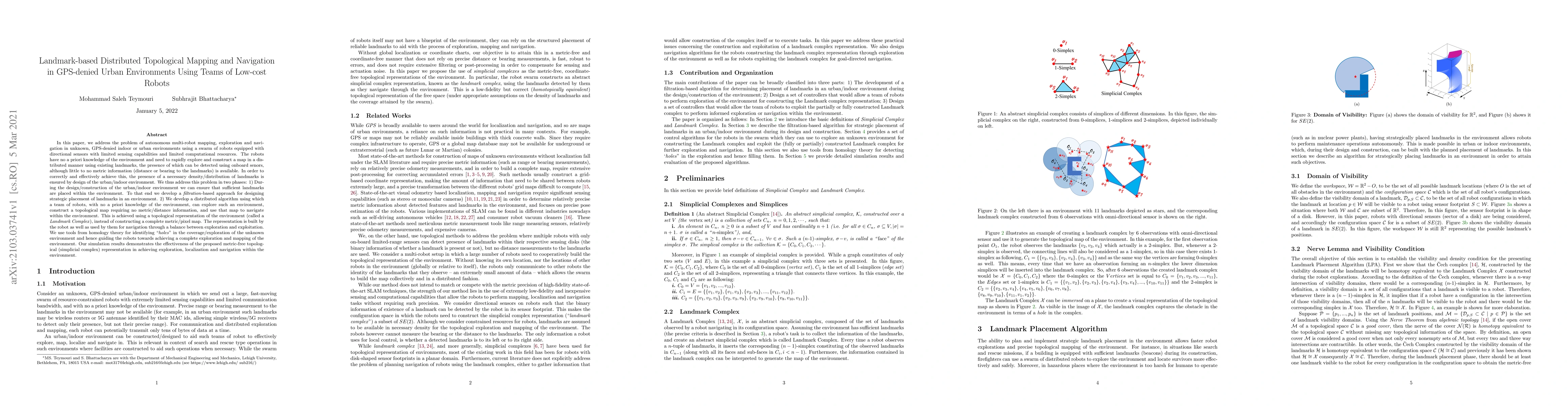 In this paper, we address the problem of autonomous multi-robot mapping, exploration and navigation in unknown, GPS-denied indoor or urban environments using a swarm of robots equipped with directional sensors with limited sensing capabilities and limited computational resources. The robots have no a priori knowledge of the environment and need to rapidly explore and construct a map in a distributed manner using existing landmarks, the presence of which can be detected using onboard senors, although little to no metric information (distance or bearing to the landmarks) is available. In order to correctly and effectively achieve this, the presence of a necessary density/distribution of landmarks is ensured by design of the urban/indoor environment. We thus address this problem in two phases: 1) During the design/construction of the urban/indoor environment we can ensure that sufficient landmarks are placed within the environment. To that end we develop a filtration-based approach for designing strategic placement of landmarks in an environment. 2) We develop a distributed algorithm using which a team of robots, with no a priori knowledge of the environment, can explore such an environment, construct a topological map requiring no metric/distance information, and use that map to navigate within the environment. This is achieved using a topological representation of the environment (called a Landmark Complex), instead of constructing a complete metric/pixel map. The representation is built by the robot as well as used by them for navigation through a balance between exploration and exploitation. We use tools from homology theory for identifying "holes" in the coverage/exploration of the unknown environment and hence guiding the robots towards achieving a complete exploration and mapping of the environment.