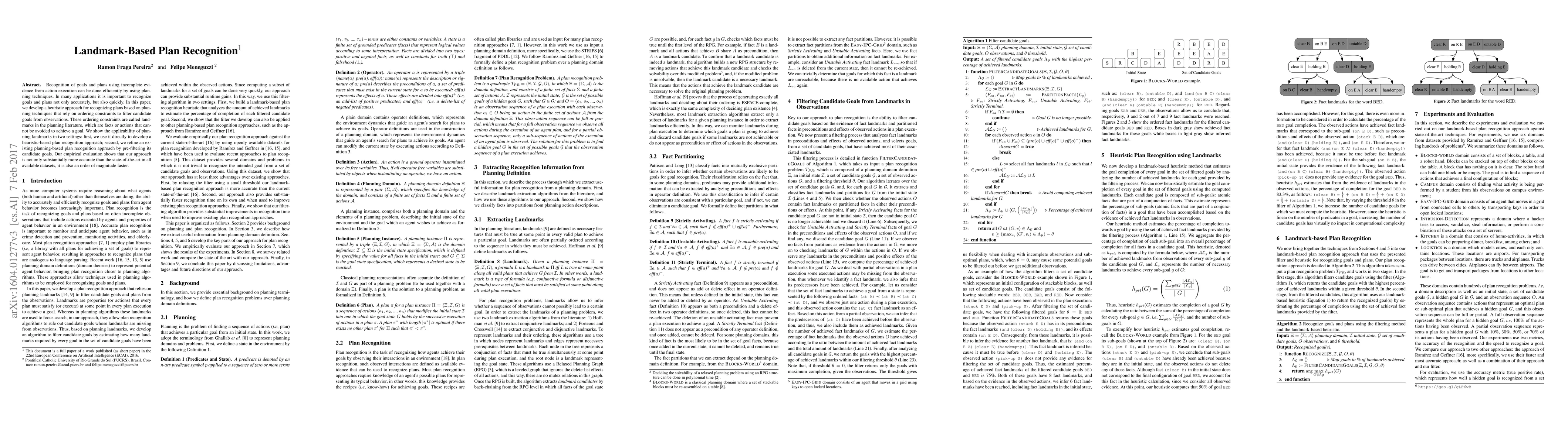 This paper proposes a heuristic plan recognition method using planning landmarks, which are unavoidable facts or actions, to efficiently filter candidate goals from observations. The method is shown to be significantly more accurate and faster than existing approaches in empirical evaluations.