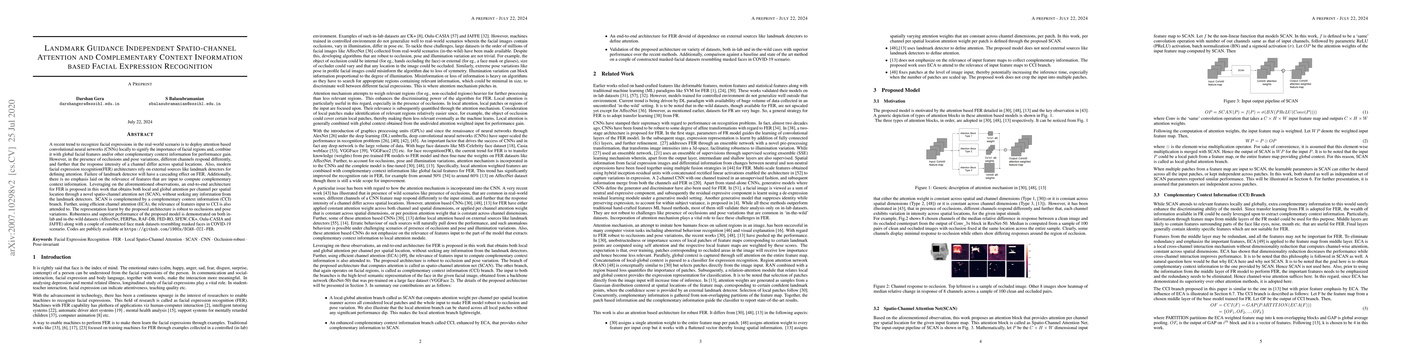 This paper proposes an end-to-end facial expression recognition (FER) architecture that uses a novel spatio-channel attention net (SCAN) to provide local and global attention per channel per spatial location, eliminating the need for external landmark detectors. It also integrates a complementary context information (CCI) branch and efficient channel attention (ECA) to enhance feature relevance, demonstrating robustness to occlusions and pose variations.