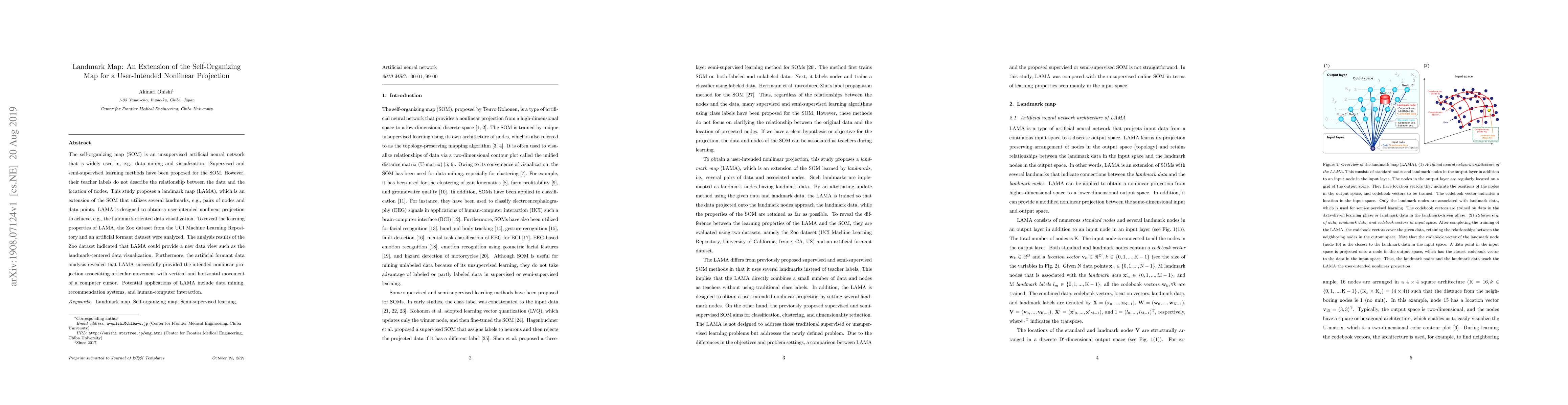 The self-organizing map (SOM) is an unsupervised artificial neural network that is widely used in, e.g., data mining and visualization. Supervised and semi-supervised learning methods have been proposed for the SOM. However, their teacher labels do not describe the relationship between the data and the location of nodes. This study proposes a landmark map (LAMA), which is an extension of the SOM that utilizes several landmarks, e.g., pairs of nodes and data points. LAMA is designed to obtain a user-intended nonlinear projection to achieve, e.g., the landmark-oriented data visualization. To reveal the learning properties of LAMA, the Zoo dataset from the UCI Machine Learning Repository and an artificial formant dataset were analyzed. The analysis results of the Zoo dataset indicated that LAMA could provide a new data view such as the landmark-centered data visualization. Furthermore, the artificial formant data analysis revealed that LAMA successfully provided the intended nonlinear projection associating articular movement with vertical and horizontal movement of a computer cursor. Potential applications of LAMA include data mining, recommendation systems, and human-computer interaction.