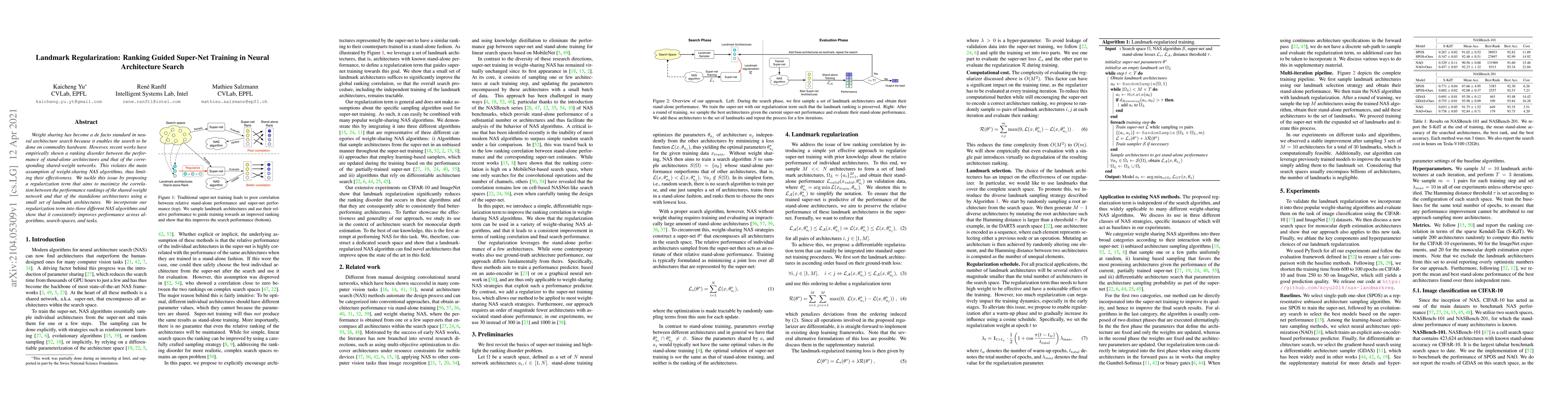 The paper introduces a regularization term that maximizes the correlation between shared-weight network performance and standalone architectures using a small set of landmark architectures, which is integrated into various NAS algorithms.