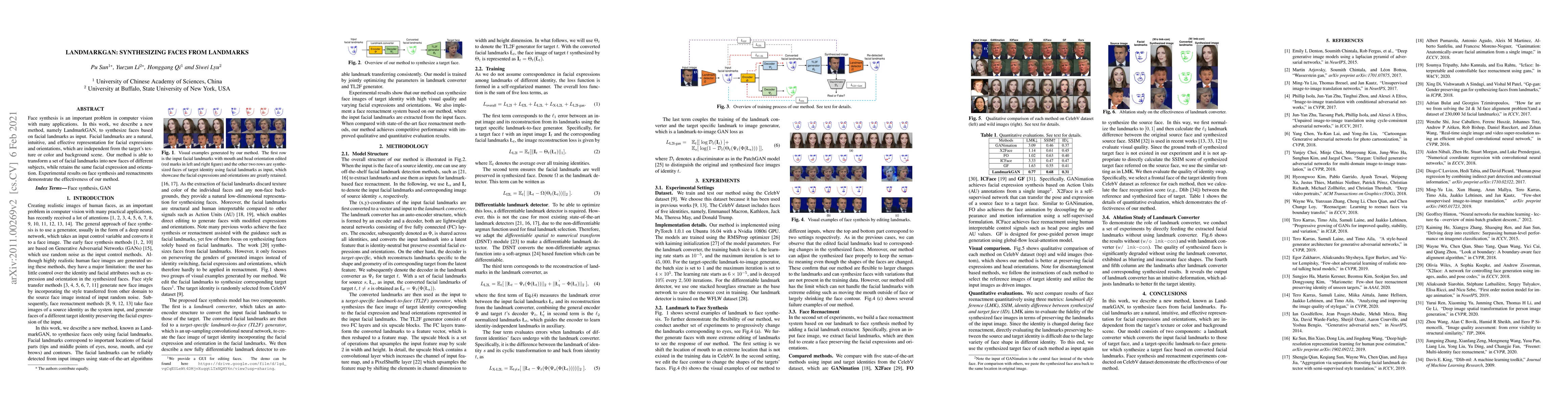 LandmarkGAN presents a novel method for synthesizing faces using facial landmarks as input, enabling the transformation of landmarks into new faces while maintaining the original expression and orientation. Experimental results show the method's effectiveness in face synthesis and reenactments.