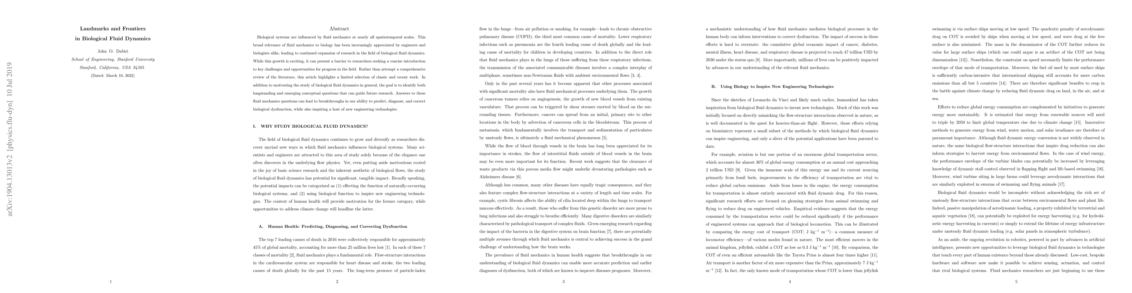 Biological systems are influenced by fluid mechanics at nearly all spatiotemporal scales. This broad relevance of fluid mechanics to biology has been increasingly appreciated by engineers and biologists alike, leading to continued expansion of research in the field of biological fluid dynamics. While this growth is exciting, it can present a barrier to researchers seeking a concise introduction to key challenges and opportunities for progress in the field. Rather than attempt a comprehensive review of the literature, this article highlights a limited selection of classic and recent work. In addition to motivating the study of biological fluid dynamics in general, the goal is to identify both longstanding and emerging conceptual questions that can guide future research. Answers to these fluid mechanics questions can lead to breakthroughs in our ability to predict, diagnose, and correct biological dysfunction, while also inspiring a host of new engineering technologies.