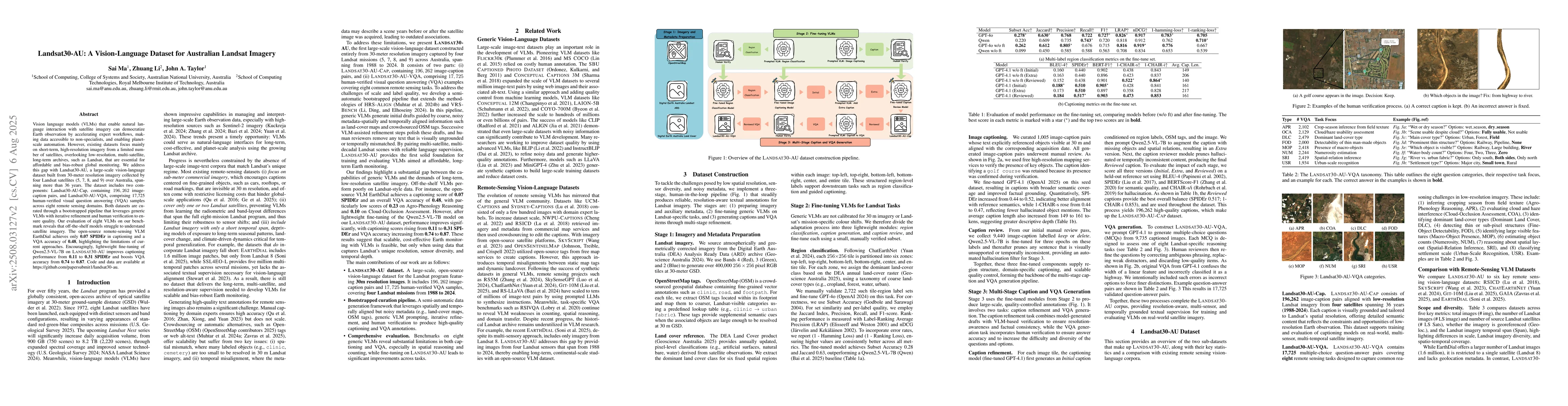Vision language models (VLMs) that enable natural language interaction with satellite imagery can democratize Earth observation by accelerating expert workflows, making data accessible to non-specialists, and enabling planet-scale automation. However, existing datasets focus mainly on short-term, high-resolution imagery from a limited number of satellites, overlooking low-resolution, multi-satellite, long-term archives, such as Landsat, that are essential for affordable and bias-robust global monitoring. We address this gap with Landsat30-AU, a large-scale vision-language dataset built from 30-meter resolution imagery collected by four Landsat satellites (5, 7, 8, and 9) over Australia, spanning more than 36 years. The dataset includes two components: Landsat30-AU-Cap, containing $196,262$ image-caption pairs, and Landsat30-AU-VQA, comprising 17,725 human-verified visual question answering (VQA) samples across eight remote sensing domains. Both datasets are curated through a bootstrapped pipeline that leverages generic VLMs with iterative refinement and human verification to ensure quality. Our evaluation of eight VLMs on our benchmark reveals that off-the-shelf models struggle to understand satellite imagery. The open-source remote-sensing VLM EarthDial achieves only 0.07 SPIDEr in captioning and a VQA accuracy of 0.48, highlighting the limitations of current approaches. Encouragingly, lightweight fine-tuning of Qwen2.5-VL-7B on Landsat30-AU improves captioning performance from 0.11 to 0.31 SPIDEr and boosts VQA accuracy from 0.74 to 0.87. Code and data are available at https://github.com/papersubmit1/landsat30-au.