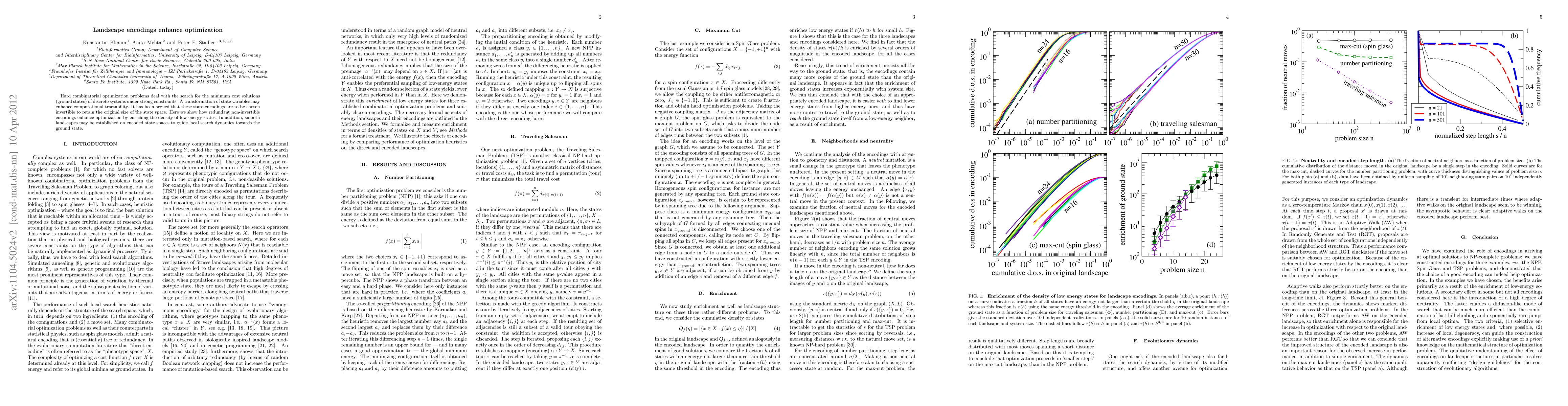 Hard combinatorial optimization problems deal with the search for the minimum cost solutions (ground states) of discrete systems under strong constraints. A transformation of state variables may enhance computational tractability. It has been argued that these state encodings are to be chosen invertible to retain the original size of the state space. Here we show how redundant non-invertible encodings enhance optimization by enriching the density of low-energy states. In addition, smooth landscapes may be established on encoded state spaces to guide local search dynamics towards the ground state.