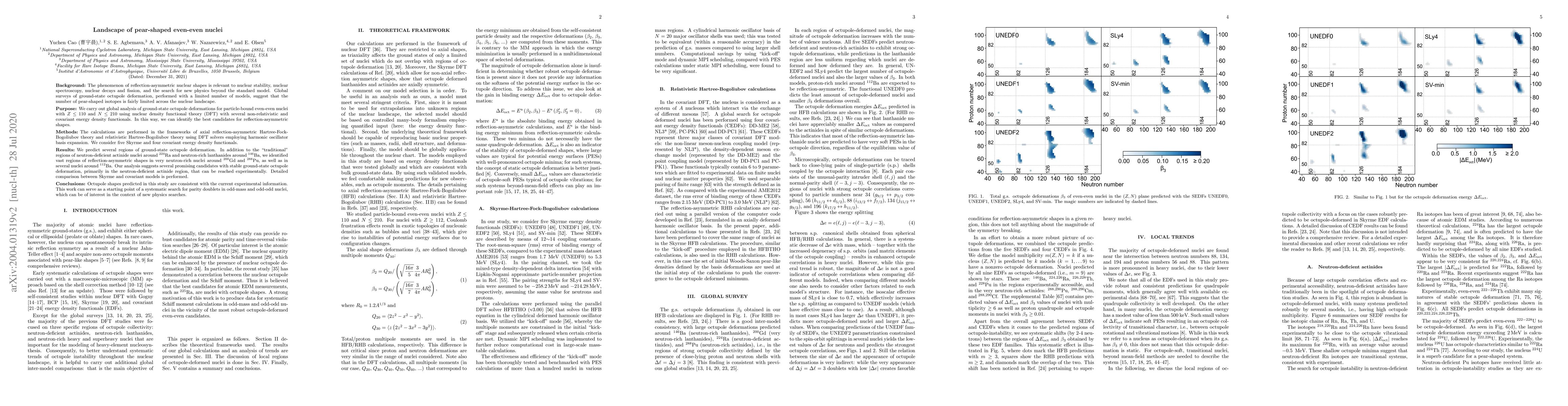 The phenomenon of reflection-asymmetric nuclear shapes is relevant to nuclear stability, nuclear spectroscopy, nuclear decays and fission, and the search for new physics beyond the standard model. Global surveys of ground-state octupole deformation, performed with a limited number of models, suggest that the number of pear-shaped isotopes is fairly limited across the nuclear landscape. We carry out global analysis of ground-state octupole deformations for particle-bound even-even nuclei with $Z \leq 110$ and $N \leq 210$ using nuclear density functional theory (DFT) with several non-relativistic and covariant energy density functionals. In this way, we can identify the best candidates for reflection-asymmetric shapes. The calculations are performed in the frameworks of axial reflection-asymmetric Hartree-Fock-Bogoliubov theory and relativistic Hartree-Bogoliubov theory using DFT solvers employing harmonic oscillator basis expansion. We consider five Skyrme and four covariant energy density functionals. We predict several regions of ground-state octupole deformation. In addition to the "traditional" regions of neutron-deficient actinide nuclei around $^{224}$Ra and neutron-rich lanthanides around $^{146}$Ba, we identified vast regions of reflecion-asymmetric shapes in very neutron-rich nuclei around $^{200}$Gd and $^{288}$Pu, as well as in several nuclei around $^{112}$Ba. Our analysis suggests several promising candidates with stable ground-state octupole deformation, primarily in the neutron-deficient actinide region, that can be reached experimentally. Detailed comparison between Skyrme and covariant models is performed.