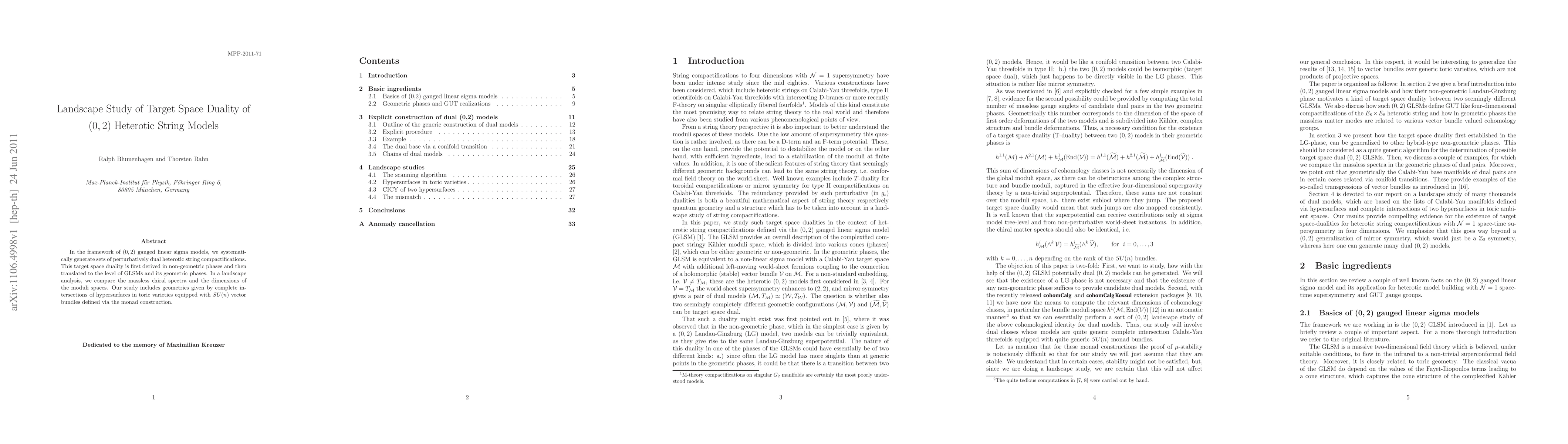 This paper explores the landscape of perturbatively dual heterotic string compactifications in (0,2) gauged linear sigma models, deriving target space duality from non-geometric phases and comparing massless spectra and moduli space dimensions across various complete intersection geometries.