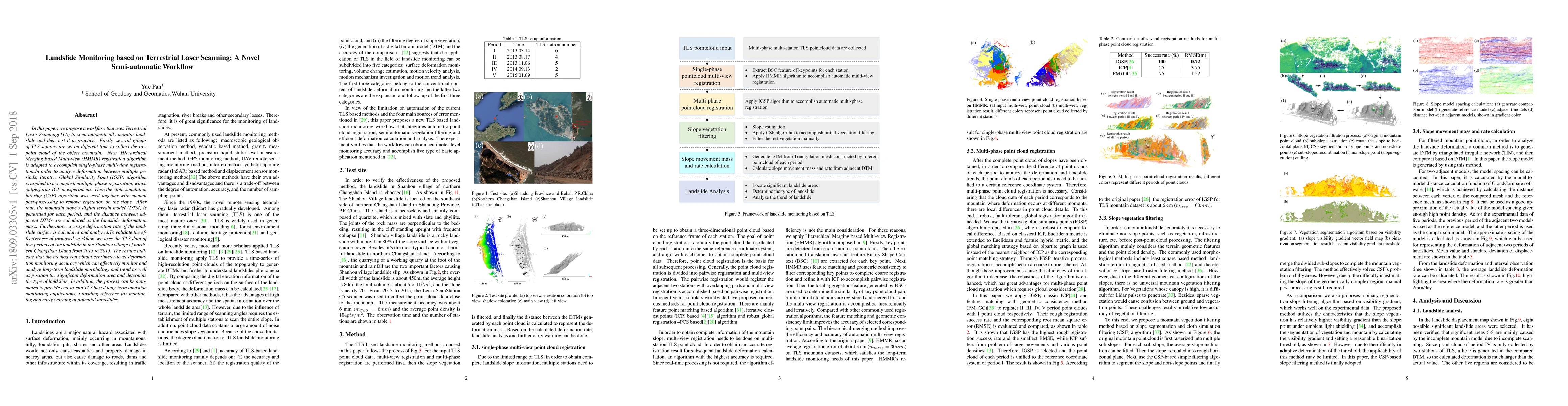 In this paper, we propose a workflow that uses Terrestrial Laser Scanning(TLS) to semi-automatically monitor landslide and then test it in practice. Firstly, several groups of TLS stations are set on different time to collect the raw point cloud of the object mountain. Next, Hierarchical Merging Based Multi-view (HMMR) registration algorithm is adapted to accomplish single-phase multi-view registration.In order to analyze deformation between multiple periods, Iterative Global Similarity Point (IGSP) algorithm is applied to accomplish multiple-phase registration, which outperforms ICP in experiments. Then the cloth simulation filtering (CSF) algorithm was used together with manual post-processing to remove vegetation on the slope. After that, the mountain slope's digital terrain model (DTM) is generated for each period, and the distance between adjacent DTMs are calculated as the landslide deformation mass. Furthermore, average deformation rate of the landslide surface is calculated and analyzed.To validate the effectiveness of proposed workflow, we uses the TLS data of five periods of the landslide in the Shanhou village of northern Changshan Island from 2013 to 2015. The results indicate that the method can obtain centimeter-level deformation monitoring accuracy which can effectively monitor and analyze long-term landslide morphology and trend as well as position the significant deformation area and determine the type of landslide. In addition, the process can be automated to provide end-to-end TLS based long-term landslide monitoring applications, providing reference for monitoring and early warning of potential landslides.