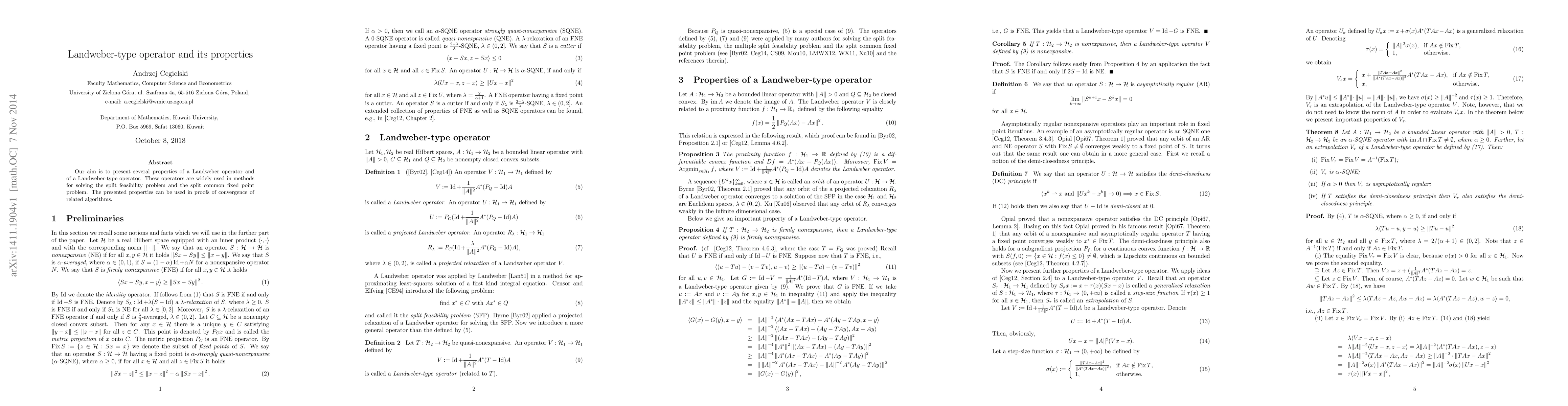 This paper investigates properties of Landweber and Landweber-type operators, emphasizing their application in solving the split feasibility and split common fixed point problems, and their role in proving the convergence of associated algorithms.