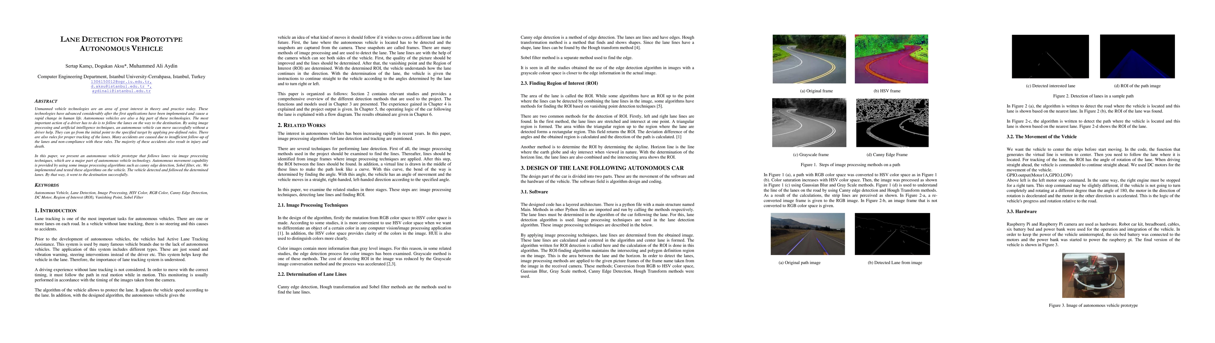 This paper presents an autonomous vehicle prototype that employs image processing techniques, including Canny edge detection and Sobel filters, to accurately follow lanes and navigate from the starting point to the destination, thereby reducing the risk of accidents caused by lane deviation. The implemented algorithms successfully enabled the vehicle to track and adhere to lane rules.