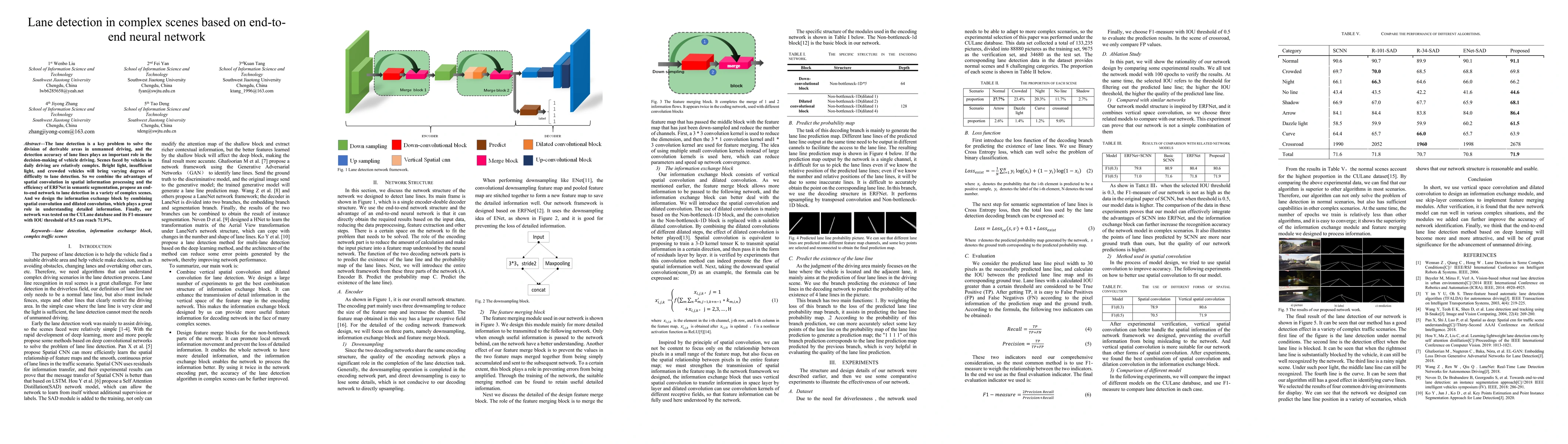The lane detection is a key problem to solve the division of derivable areas in unmanned driving, and the detection accuracy of lane lines plays an important role in the decision-making of vehicle driving. Scenes faced by vehicles in daily driving are relatively complex. Bright light, insufficient light, and crowded vehicles will bring varying degrees of difficulty to lane detection. So we combine the advantages of spatial convolution in spatial information processing and the efficiency of ERFNet in semantic segmentation, propose an end-to-end network to lane detection in a variety of complex scenes. And we design the information exchange block by combining spatial convolution and dilated convolution, which plays a great role in understanding detailed information. Finally, our network was tested on the CULane database and its F1-measure with IOU threshold of 0.5 can reach 71.9%.