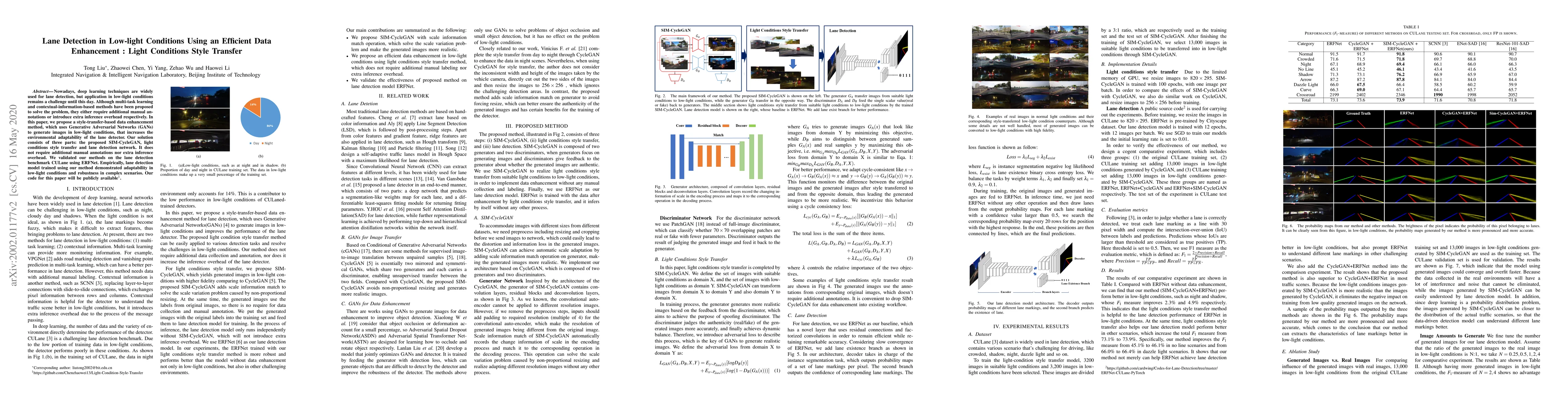 This paper proposes a style-transfer-based data enhancement method using Generative Adversarial Networks to improve lane detection in low-light conditions without requiring additional manual annotations or extra inference overhead.