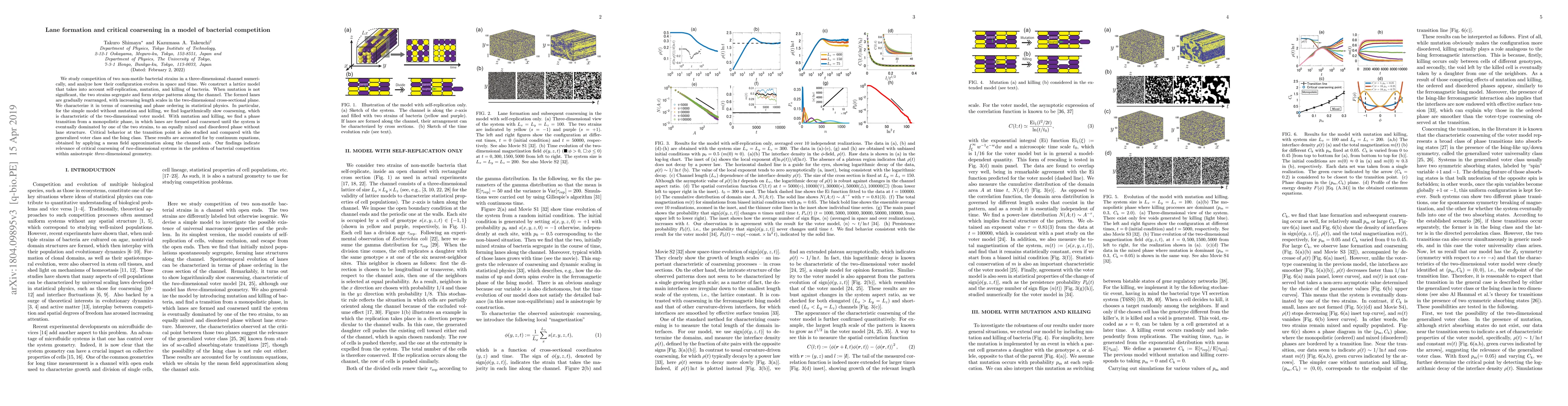This paper numerically investigates bacterial competition in a three-dimensional channel, modeling self-replication, mutation, and killing. It finds that without mutation, bacterial strains form and coarsen into lane patterns, exhibiting logarithmically slow coarsening akin to the two-dimensional voter model, while mutation and killing lead to a phase transition from segregated lanes to a disordered phase.