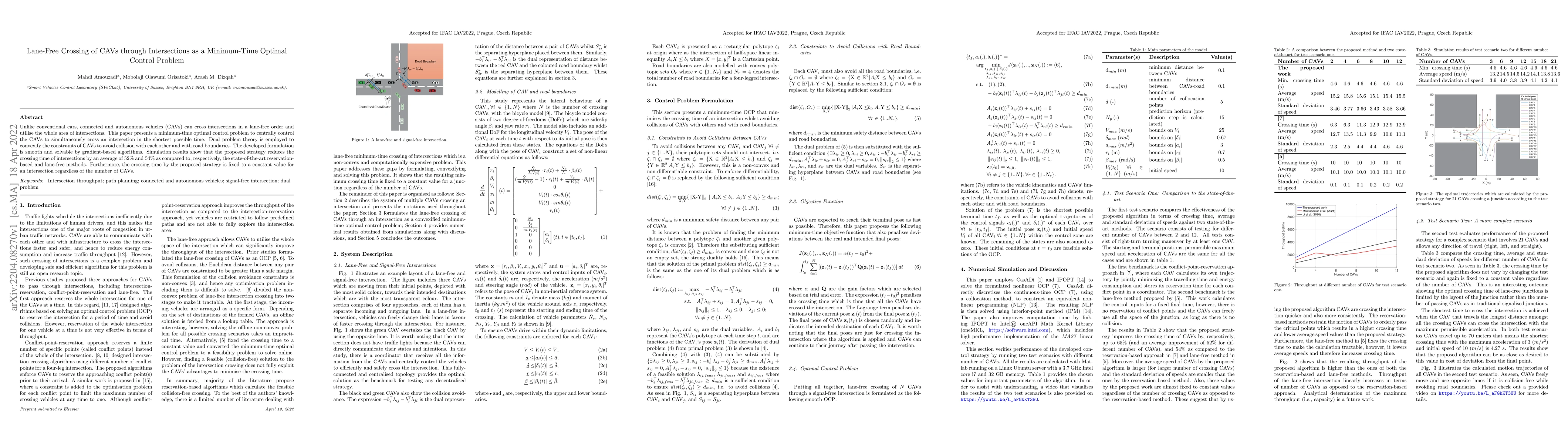 Unlike conventional cars, connected and autonomous vehicles (CAVs) can cross intersections in a lane-free order and utilise the whole area of intersections. This paper presents a minimum-time optimal control problem to centrally control the CAVs to simultaneously cross an intersection in the shortest possible time. Dual problem theory is employed to convexify the constraints of CAVs to avoid collision with each other and with road boundaries. The developed formulation is smooth and solvable by gradient-based algorithms. Simulation results show that the proposed strategy reduces the crossing time of intersections by an average of 52% and 54% as compared to, respectively, the state-of-the-art reservation-based and lane-free methods. Furthermore, the crossing time by the proposed strategy is fixed to a constant value for an intersection regardless of the number of CAVs.