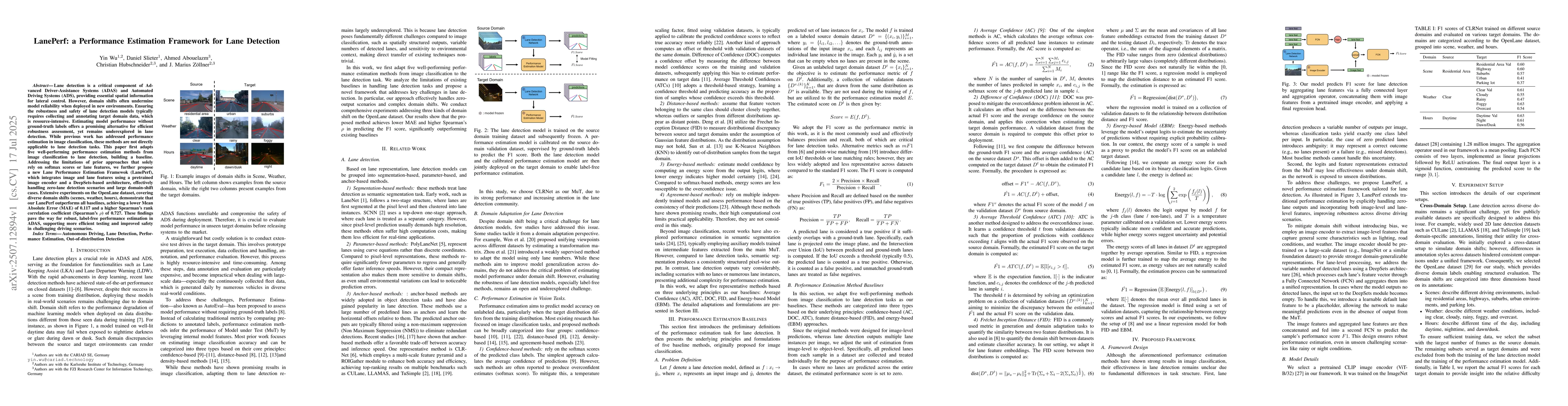 Lane detection is a critical component of Advanced Driver-Assistance Systems (ADAS) and Automated Driving System (ADS), providing essential spatial information for lateral control. However, domain shifts often undermine model reliability when deployed in new environments. Ensuring the robustness and safety of lane detection models typically requires collecting and annotating target domain data, which is resource-intensive. Estimating model performance without ground-truth labels offers a promising alternative for efficient robustness assessment, yet remains underexplored in lane detection. While previous work has addressed performance estimation in image classification, these methods are not directly applicable to lane detection tasks. This paper first adapts five well-performing performance estimation methods from image classification to lane detection, building a baseline. Addressing the limitations of prior approaches that solely rely on softmax scores or lane features, we further propose a new Lane Performance Estimation Framework (LanePerf), which integrates image and lane features using a pretrained image encoder and a DeepSets-based architecture, effectively handling zero-lane detection scenarios and large domain-shift cases. Extensive experiments on the OpenLane dataset, covering diverse domain shifts (scenes, weather, hours), demonstrate that our LanePerf outperforms all baselines, achieving a lower MAE of 0.117 and a higher Spearman's rank correlation coefficient of 0.727. These findings pave the way for robust, label-free performance estimation in ADAS, supporting more efficient testing and improved safety in challenging driving scenarios.
