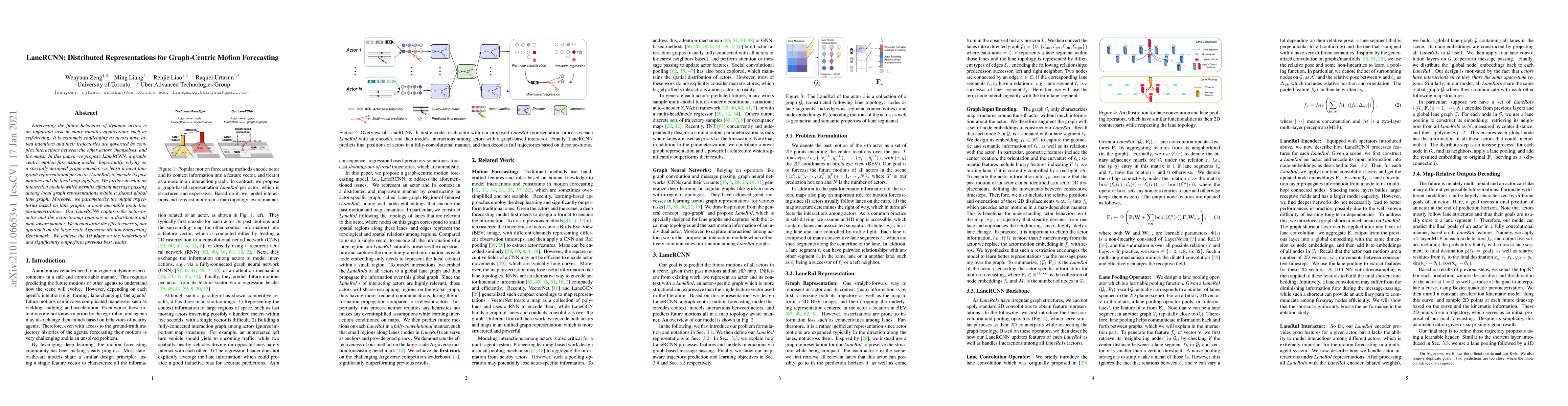 LaneRCNN proposes a graph-centric model for motion forecasting in robotics, leveraging a local lane graph representation and an efficient interaction module to capture complex actor interactions and map relations. The model achieves top performance on the Argoverse benchmark, outperforming previous methods.