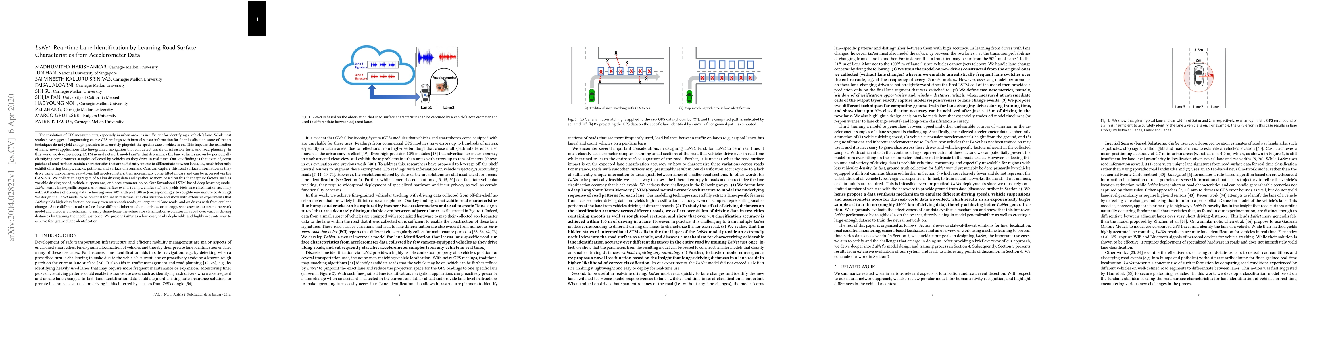The resolution of GPS measurements, especially in urban areas, is insufficient for identifying a vehicle's lane. In this work, we develop a deep LSTM neural network model LaNet that determines the lane vehicles are on by periodically classifying accelerometer samples collected by vehicles as they drive in real time. Our key finding is that even adjacent patches of road surfaces contain characteristics that are sufficiently unique to differentiate between lanes, i.e., roads inherently exhibit differing bumps, cracks, potholes, and surface unevenness. Cars can capture this road surface information as they drive using inexpensive, easy-to-install accelerometers that increasingly come fitted in cars and can be accessed via the CAN-bus. We collect an aggregate of 60 km driving data and synthesize more based on this that capture factors such as variable driving speed, vehicle suspensions, and accelerometer noise. Our formulated LSTM-based deep learning model, LaNet, learns lane-specific sequences of road surface events (bumps, cracks etc.) and yields 100% lane classification accuracy with 200 meters of driving data, achieving over 90% with just 100 m (correspondingly to roughly one minute of driving). We design the LaNet model to be practical for use in real-time lane classification and show with extensive experiments that LaNet yields high classification accuracy even on smooth roads, on large multi-lane roads, and on drives with frequent lane changes. Since different road surfaces have different inherent characteristics or entropy, we excavate our neural network model and discover a mechanism to easily characterize the achievable classification accuracies in a road over various driving distances by training the model just once. We present LaNet as a low-cost, easily deployable and highly accurate way to achieve fine-grained lane identification.