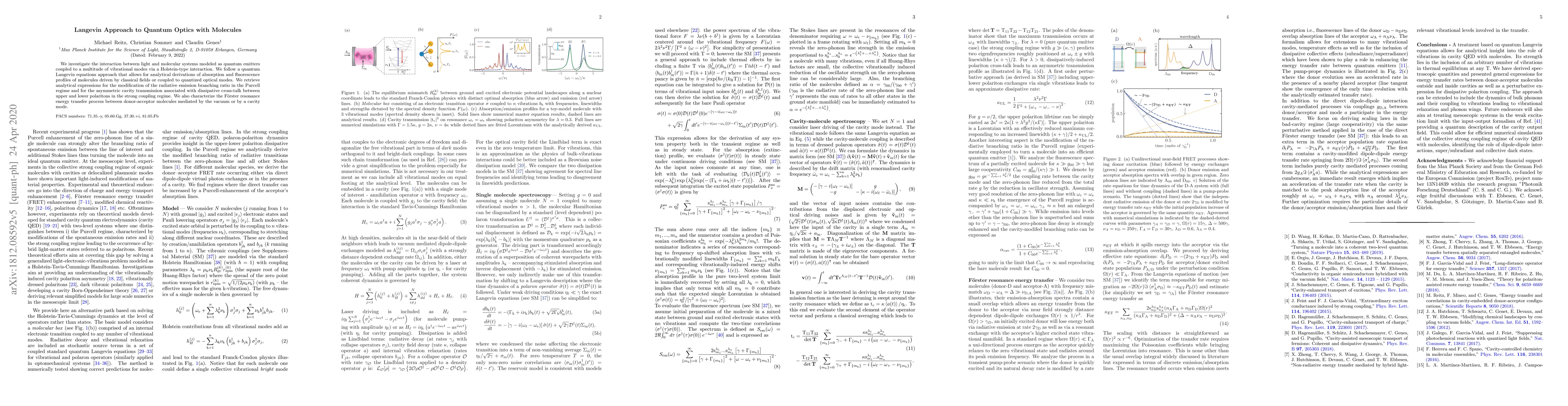 This paper explores the interaction between light and molecular quantum emitters using quantum Langevin equations, deriving analytical expressions for absorption, fluorescence profiles, and Förster resonance energy transfer, particularly in the Purcell and strong coupling regimes. It also examines the impact of dissipative cross-talk between polaritons in asymmetric cavities.