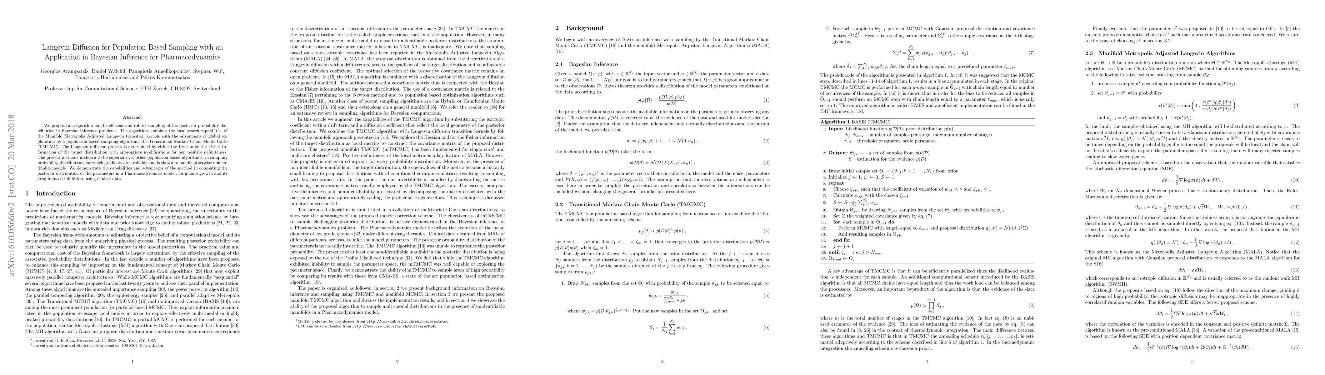 We propose an algorithm for the efficient and robust sampling of the posterior probability distribution in Bayesian inference problems. The algorithm combines the local search capabilities of the Manifold Metropolis Adjusted Langevin transition kernels with the advantages of global exploration by a population based sampling algorithm, the Transitional Markov Chain Monte Carlo (TMCMC). The Langevin diffusion process is determined by either the Hessian or the Fisher Information of the target distribution with appropriate modifications for non positive definiteness. The present methods is shown to be superior over other population based algorithms, in sampling probability distributions for which gradients are available and is shown to handle otherwise unidentifiable models. We demonstrate the capabilities and advantages of the method in computing the posterior distribution of the parameters in a Pharmacodynamics model, for glioma growth and its drug induced inhibition, using clinical data.