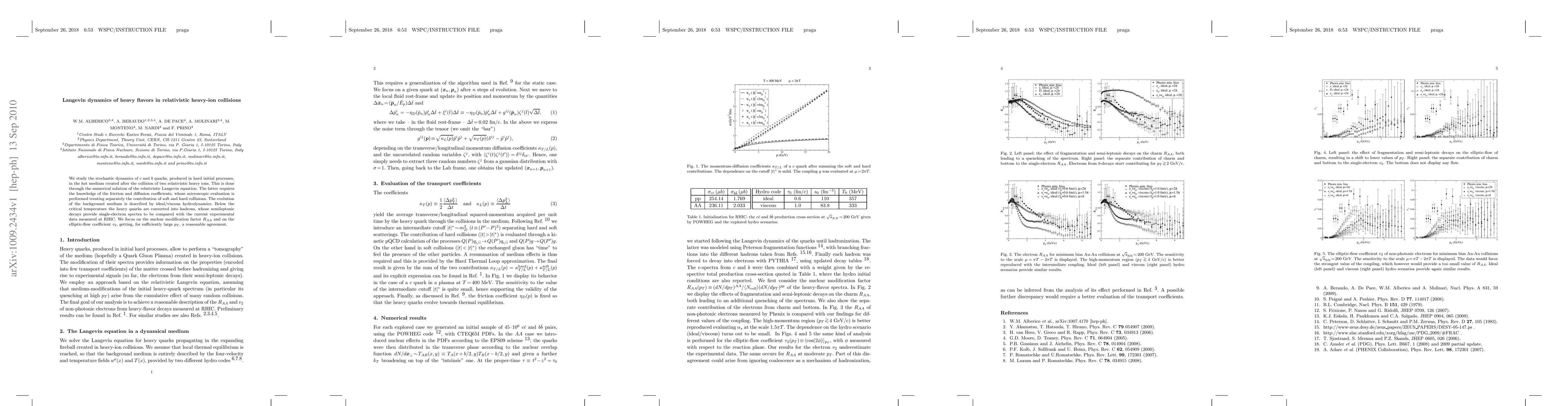 We study the stochastic dynamics of c and b quarks, produced in hard initial processes, in the hot medium created after the collision of two relativistic heavy ions. This is done through the numerical solution of the relativistic Langevin equation. The latter requires the knowledge of the friction and diffusion coefficients, whose microscopic evaluation is performed treating separately the contribution of soft and hard collisions. The evolution of the background medium is described by ideal/viscous hydrodynamics. Below the critical temperature the heavy quarks are converted into hadrons, whose semileptonic decays provide single-electron spectra to be compared with the current experimental data measured at RHIC. We focus on the nuclear modification factor R_AA and on the elliptic-flow coefficient v_2, getting, for sufficiently large p_T, a reasonable agreement.