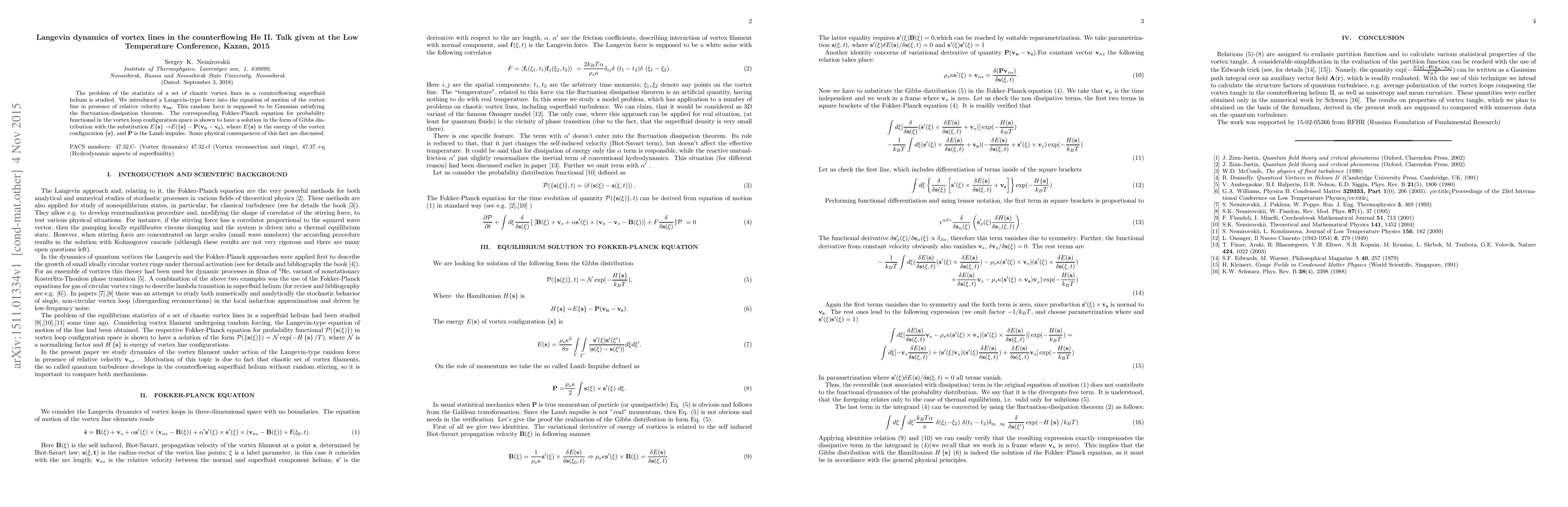 This paper investigates the statistical behavior of vortex lines in counterflowing superfluid helium using Langevin dynamics. A Langevin-type force is introduced to model the vortex line motion under relative velocity, with a Gaussian random force adhering to the fluctuation-dissipation theorem. The study reveals that the Fokker-Planck equation for the vortex configuration has a solution in the form of a Gibbs distribution, with implications for vortex dynamics and superfluid hydrodynamics.