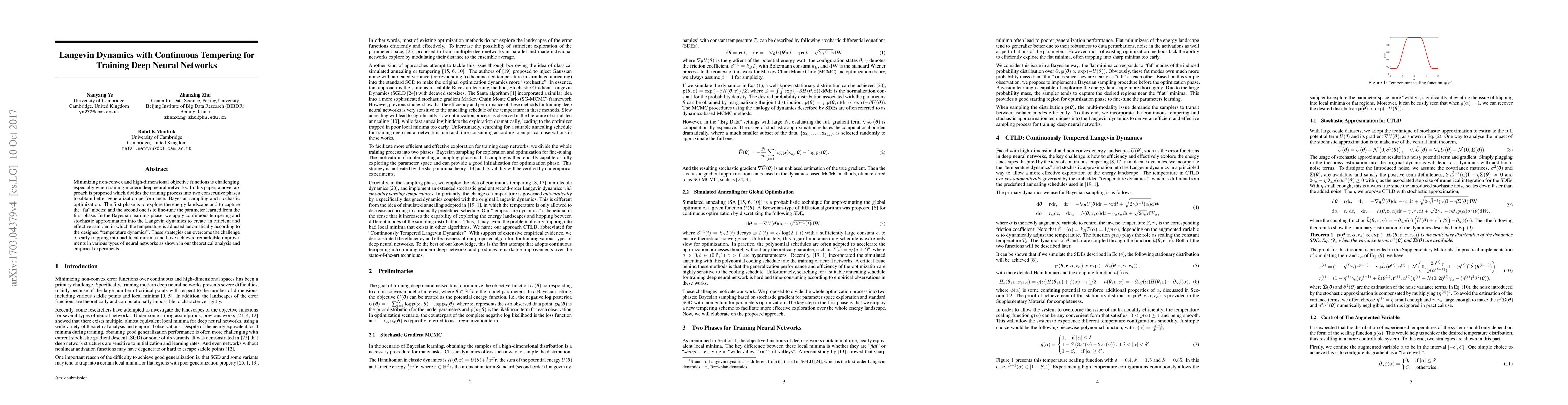 This paper proposes a novel two-phase training method for deep neural networks using Langevin Dynamics with continuous tempering. The method combines Bayesian sampling to explore the energy landscape and stochastic optimization to fine-tune parameters, improving generalization performance and overcoming local minima issues.