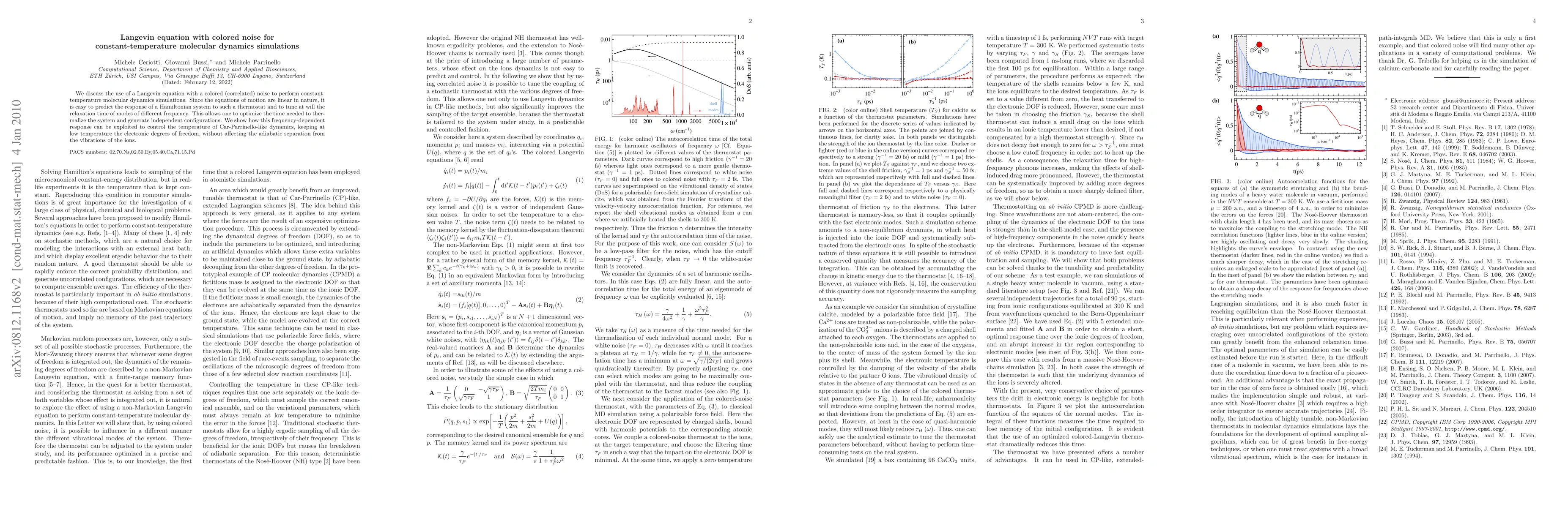 This paper explores the application of a Langevin equation with colored noise for constant-temperature molecular dynamics simulations, enabling precise control over the relaxation time of different frequency modes to optimize thermalization and configuration generation. It demonstrates how this method can maintain low electronic temperature in Car-Parrinello-like dynamics without disrupting the separation of ions' vibrations.