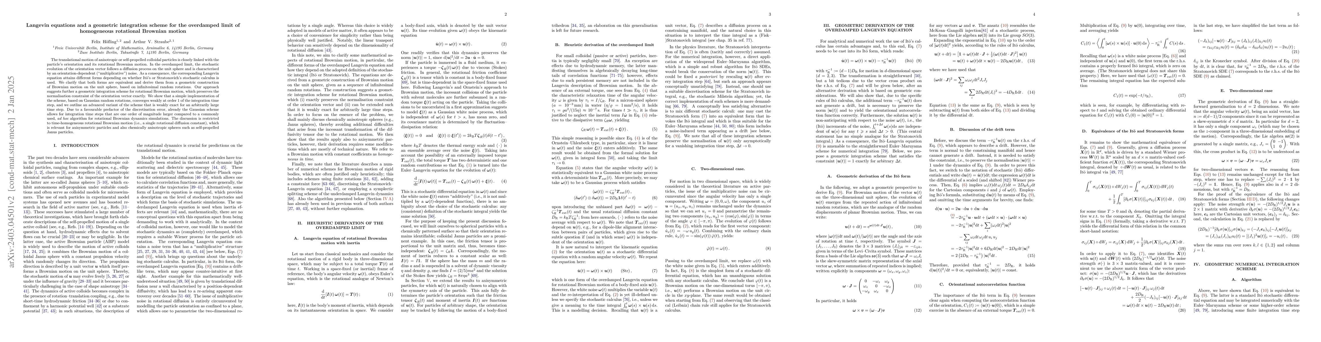 The translational motion of anisotropic and self-propelled colloidal particles is closely linked with the particle's orientation and its rotational Brownian motion. In the overdamped limit, the stochastic evolution of the orientation vector follows a diffusion process on the unit sphere and is characterised by an orientation-dependent ("multiplicative") noise. As a consequence, the corresponding Langevin equation attains different forms depending on whether It\=o's or Stratonovich's stochastic calculus is used. We clarify that both forms are equivalent and derive them from a geometric construction of Brownian motion on the unit sphere, based on infinitesimal random rotations. Our approach suggests further a geometric integration scheme for rotational Brownian motion, which preserves the normalisation constraint of the orientation vector exactly. We show that a simple implementation of the scheme converges weakly at order 1 of the integration time step, and we outline an advanced variant of the scheme that is weakly exact for an arbitrarily large time step. The discussion is restricted to time-homogeneous rotational Brownian motion (i.e., constant rotational diffusion tensor), which is relevant for chemically anisotropic spheres such as self-propelled Janus particles.