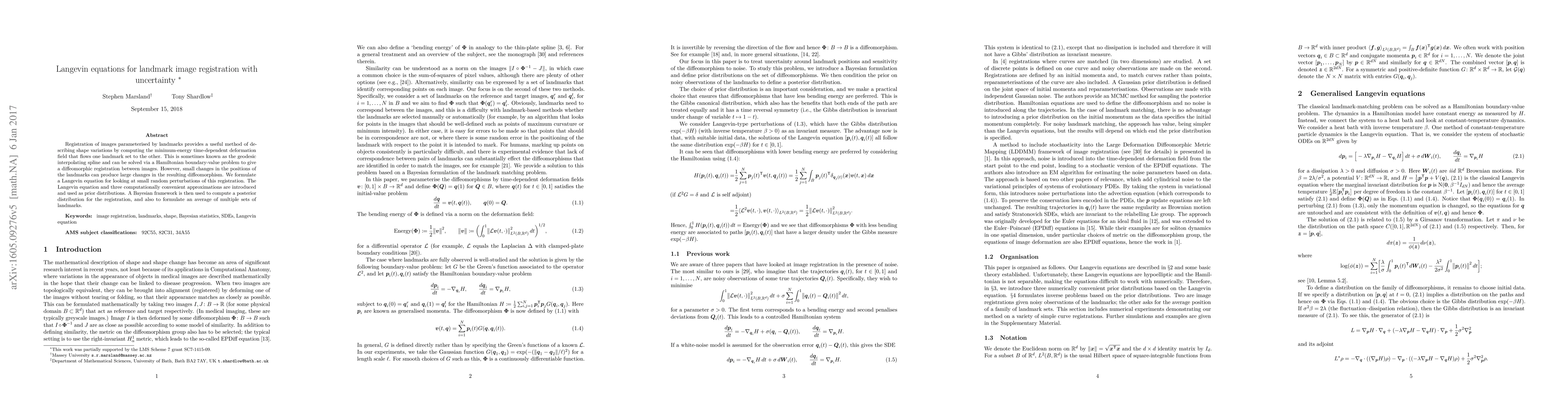 Registration of images parameterised by landmarks provides a useful method of describing shape variations by computing the minimum-energy time-dependent deformation field that flows one landmark set to the other. This is sometimes known as the geodesic interpolating spline and can be solved via a Hamiltonian boundary-value problem to give a diffeomorphic registration between images. However, small changes in the positions of the landmarks can produce large changes in the resulting diffeomorphism. We formulate a Langevin equation for looking at small random perturbations of this registration. The Langevin equation and three computationally convenient approximations are introduced and used as prior distributions. A Bayesian framework is then used to compute a posterior distribution for the registration, and also to formulate an average of multiple sets of landmarks.