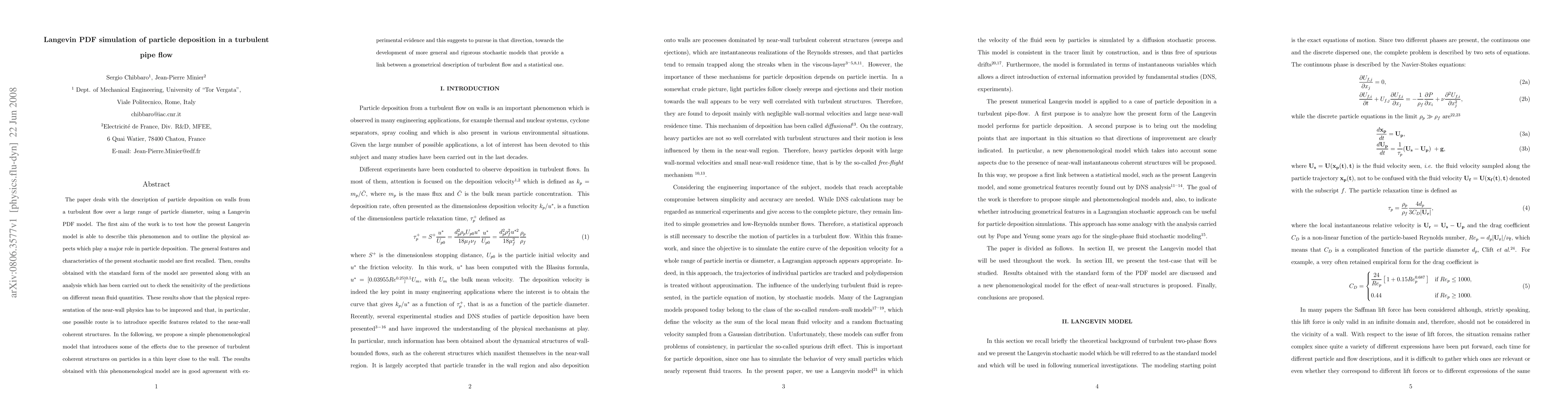 This paper uses a Langevin PDF model to simulate particle deposition in turbulent pipe flow, testing the model's ability to describe the phenomenon and identifying key physical factors. The study proposes a phenomenological model to better represent the effects of near-wall turbulent structures, achieving good agreement with experimental data.