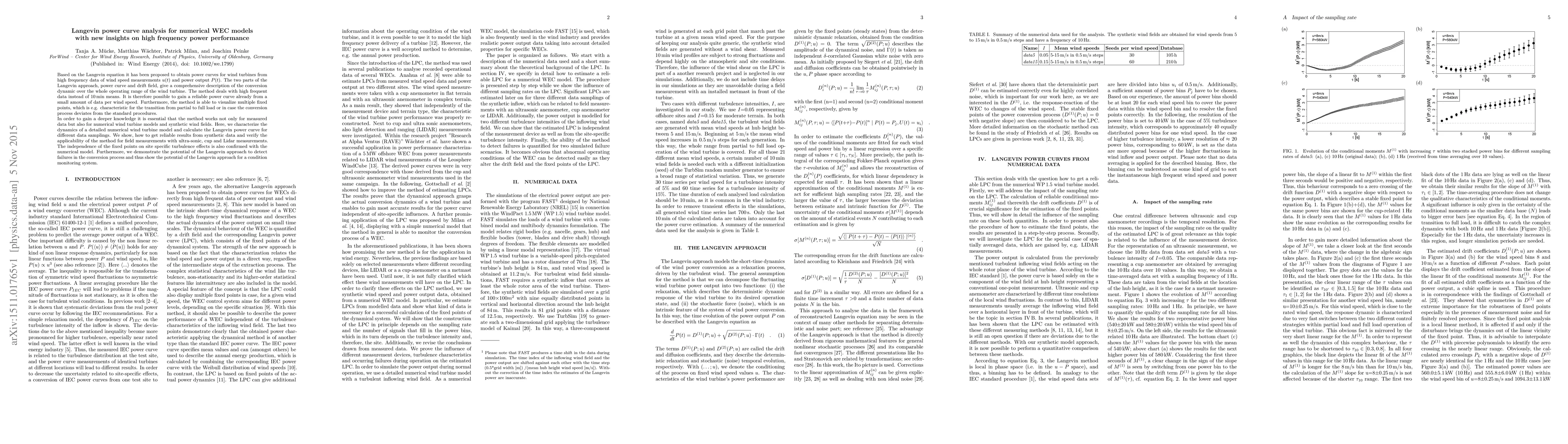 Based on the Langevin equation it has been proposed to obtain power curves for wind turbines from high frequency data of wind speed measurements u(t) and power output P (t). The two parts of the Langevin approach, power curve and drift field, give a comprehensive description of the conversion dynamic over the whole operating range of the wind turbine. The method deals with high frequent data instead of 10 min means. It is therefore possible to gain a reliable power curve already from a small amount of data per wind speed. Furthermore, the method is able to visualize multiple fixed points, which is e.g. characteristic for the transition from partial to full load or in case the conversion process deviates from the standard procedures. In order to gain a deeper knowledge it is essential that the method works not only for measured data but also for numerical wind turbine models and synthetic wind fields. Here, we characterize the dynamics of a detailed numerical wind turbine model and calculate the Langevin power curve for different data samplings. We show, how to get reliable results from synthetic data and verify the applicability of the method for field measurements with ultra-sonic, cup and Lidar measurements. The independence of the fixed points on site specific turbulence effects is also confirmed with the numerical model. Furthermore, we demonstrate the potential of the Langevin approach to detect failures in the conversion process and thus show the potential of the Langevin approach for a condition monitoring system.