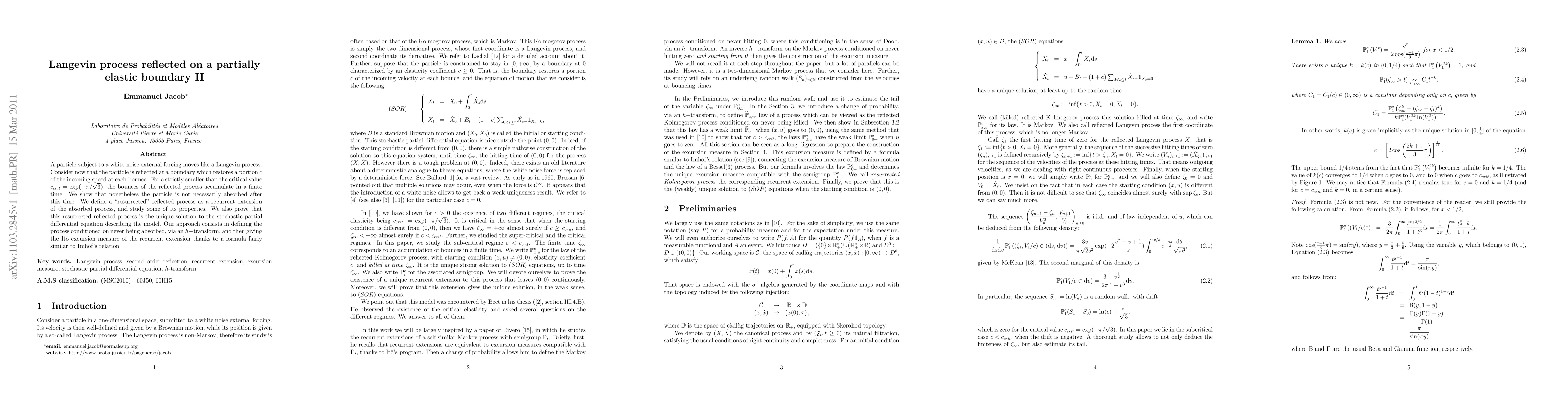 A particle subject to a white noise external forcing moves like a Langevin process. Consider now that the particle is reflected at a boundary which restores a portion c of the incoming speed at each bounce. For c strictly smaller than the critical value 0.1630, the bounces of the reflected process accumulate in a finite time. We show that nonetheless the particle is not necessarily absorbed after this time. We define a "resurrected" reflected process as a recurrent extension of the absorbed process, and study some of its properties. We also prove that this resurrected reflected process is the unique solution to the stochastic partial differential equation describing the model. Our approach consists in defining the process conditioned on never being absorbed, via an h-transform, and then giving the Ito excursion measure of the recurrent extension thanks to a formula fairly similar to Imhof's relation.