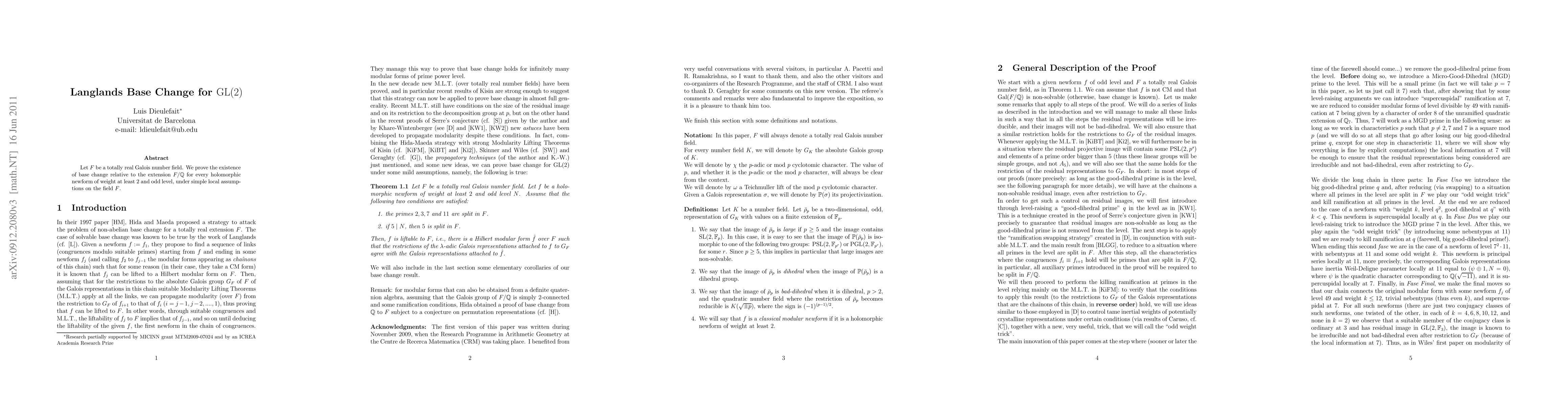 Summary: This paper proves the base change for GL(2) in the context of totally real Galois number fields F/Q, establishing its existence for every classical newform of odd level under straightforward local assumptions.