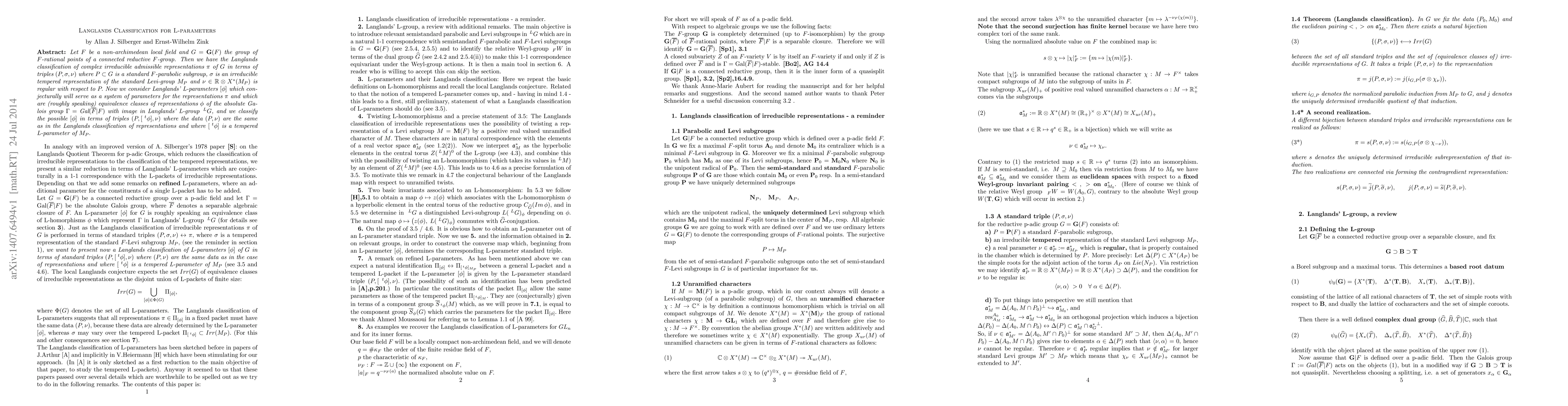 Let $F$ be a non-archimedean local field and $G={\bf{G}}(F)$ the group of $F$-rational points of a connected reductive $F$-group. Then we have the Langlands classification of complex irreducible admissible representations $\pi$ of $G$ in terms of triples $(P,\sigma,\nu)$ where $P\subset G$ is a standard $F$-parabolic subgroup, $\sigma$ is an irreducible tempered representation of the standard Levi-group $M_P$ and $\nu \in \Bbb{R}\otimes X^*(M_P)$ is regular with respect to $P.$ Now we consider Langlands' L-parameters $[\phi]$ which conjecturally will serve as a system of parameters for the representations $\pi$ and which are (roughly speaking) equivalence classes of representations $\phi$ of the absolute Galois group $\Gamma=\text{Gal}(\overline{F}|F)$ with image in Langlands' L-group $\,^LG$, and we classify the possible $[\phi]$ in terms of triples $(P,[\,^t\phi],\nu)$ where the data $(P,\nu)$ are the same as in the Langlands classification of representations and where $[\,^t\phi]$ is a tempered L-parameter of $M_P.$