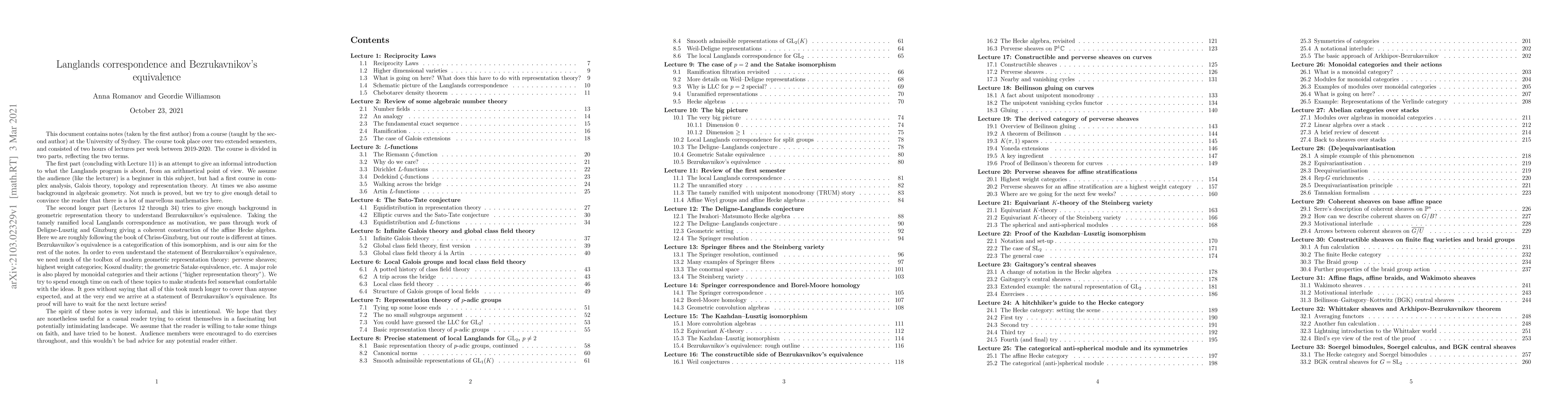 These are lecture notes (by the first author) from a course (by the second author) given over two extended semesters at the University of Sydney. The first part provides an introduction to the Langlands correspondence from an arithmetical point of view. The second part gives enough background in geometric representation theory to understand Bezrukavnikov's equivalence, which is a categorification of Kazhdan and Lusztig's two realizations of the affine Hecke algebra.